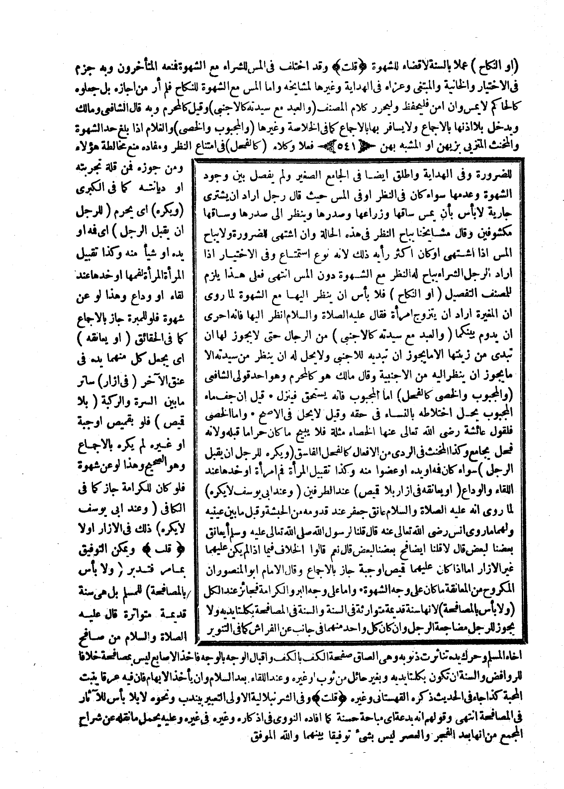 وَفِي الْهِدَايَةِ وَأَطْلَقَ أَيْضًا فِي الْجَامِعِ الصَّغِيرِ وَلَمْ يَفْصِلْ بَيْنَ وُجُودِ الشَّهْوَةِ وَعَدَمِهَا سَوَاءٌ كَانَ فِي النَّظَرِ أَوْ فِي الْمَسِّ حَيْثُ قَالَ رَجُلٌ أَرَادَ أَنْ يَشْتَرِيَ جَارِيَةً لَا بَأْسَ بِأَنْ يَمَسَّ سَاقَهَا وَذِرَاعَهَا وَصَدْرَهَا وَيَنْظُرُ إلَى صَدْرِهَا وَسَاقِهَا مَكْشُوفَيْنِ وَقَالَ مَشَايِخُنَا يُبَاحُ النَّظَرُ فِي هَذِهِ الْحَالَةِ وَإِنْ اشْتَهَى لِلضَّرُورَةِ وَلَا يُبَاحُ الْمَسُّ إذَا اشْتَهَى أَوْ كَانَ أَكْثَرَ رَأْيِهِ ذَلِكَ لِأَنَّهُ نَوْعُ اسْتِمْتَاعٍ.