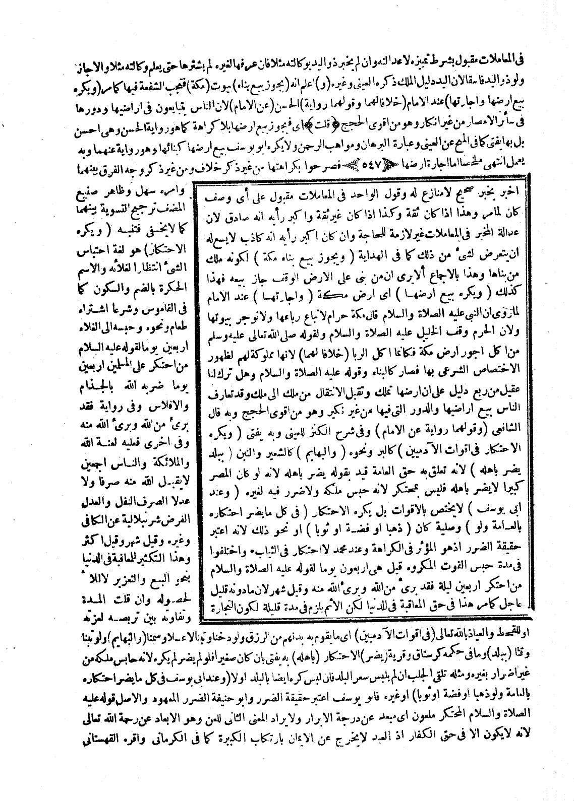 (وَيُكْرَهُ الِاحْتِكَارُ فِي أَقْوَاتِ الْآدَمِيِّينَ) كَالْبُرِّ وَنَحْوِهِ (وَالْبَهَائِمِ) كَالشَّعِيرِ وَالتِّبْنِ (بِبَلَدٍ يَضُرُّ بِأَهْلِهِ) لِأَنَّهُ تَعَلَّقَ بِهِ حَقُّ الْعَامَّةِ قَيَّدَ بِقَوْلِهِ يَضُرُّ بِأَهْلِهِ؛ لِأَنَّهُ لَوْ كَانَ الْمِصْرُ كَبِيرًا لَا يَضُرُّ بِأَهْلِهِ فَلَيْسَ بِمُحْتَكَرٍ لِأَنَّهُ حَبَسَ مِلْكَهُ وَلَا ضَرَرَ فِيهِ لِغَيْرِهِ (وَعِنْدَ أَبِي يُوسُفَ) لَا يَخْتَصُّ بِالْأَقْوَاتِ بَلْ يُكْرَهُ الِاحْتِكَارُ (فِي كُلِّ مَا يَضُرُّ احْتِكَارُهُ بِالْعَامَّةِ وَلَوْ) وَصْلِيَّةٌ كَانَ (ذَهَبًا أَوْ فِضَّةً أَوْ ثَوْبًا) أَوْ نَحْوَ ذَلِكَ؛ لِأَنَّهُ اعْتَبَرَ حَقِيقَةَ الضَّرَرِ إذْ هُوَ الْمُؤَثِّرُ فِي الْكَرَاهَةِ وَعِنْدَ مُحَمَّدٍ لَا احْتِكَارَ فِي الثِّيَابِ.