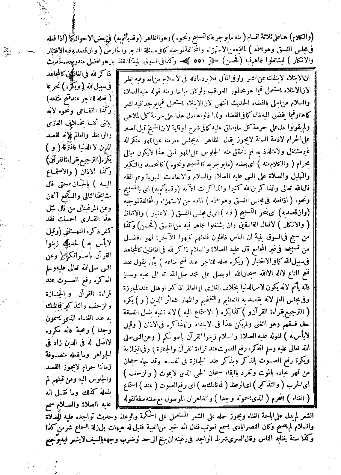 (وَإِنْ قَصَدَ بِهِ) أَيْ بِنَحْوِ التَّسْبِيحِ (فِيهِ) أَيْ فِي مَجْلِسِ الْفِسْقِ (الِاعْتِبَارَ) وَالِاتِّعَاظَ (وَالْإِنْكَارَ) لِأَفْعَالِ الْفَاسِقِينَ وَأَنْ يَشْتَغِلُوا عَمَّا هُمْ فِيهِ مِنْ الْفِسْقِ (فَحَسَنٌ) وَكَذَا مَنْ سَبَّحَ فِي السُّوقِ بِنِيَّةِ أَنَّ النَّاسَ غَافِلُونَ فَلَعَلَّهُمْ تَنَبَّهُوا لِلْآخِرَةِ فَهُوَ أَفْضَلُ مِنْ تَسْبِيحِهِ فِي غَيْرِ الْمَجَامِعِ قَالَ «- عَلَيْهِ الصَّلَاةُ وَالسَّلَامُ - ذَاكِرُ اللَّهِ فِي الْغَافِلِينَ كَالْمُجَاهِدِ فِي سَبِيلِ اللَّهِ» كَمَا فِي الِاخْتِيَارِ (وَيُكْرَهُ فِعْلُهُ لِلتَّاجِرِ عِنْدَ فَتْحِ مَتَاعِهِ) بِأَنْ يَقُولَ عِنْدَ فَتْحِ الْمَتَاعِ لَا إلَهَ إلَّا اللَّهُ سُبْحَانَ اللَّهِ أَوْ يُصَلِّي عَلَى مُحَمَّدٍ - صَلَّى اللَّهُ تَعَالَى عَلَيْهِ وَسَلَّمَ - فَإِنَّهُ يَأْثَمُ لِأَنَّهُ يَكُونُ لِأَمْرِ الدُّنْيَا بِخِلَافِ الْغَازِي أَوْ الْعَالِمِ إذَا كَبَّرَ أَوْ هَلَّلَ عِنْدَ الْمُبَارَزَةِ وَفِي مَجْلِسِ الْعِلْمِ لِأَنَّهُ يَقْصِدُ بِهِ التَّعْظِيمَ وَالتَّفْخِيمَ وَإِظْهَارَ شَعَائِرِ الدِّينِ.