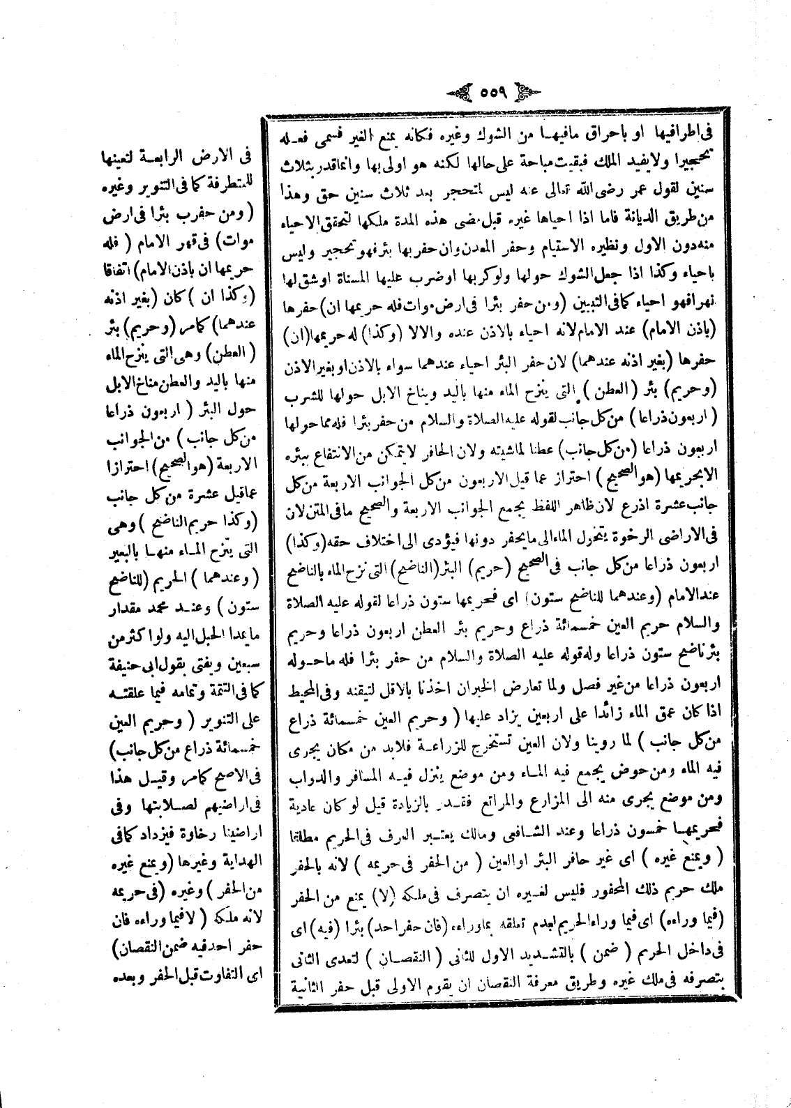 وَفِي الْمُحِيطِ إذَا كَانَ عُمْقُ الْمَاءِ زَائِدًا عَلَى أَرْبَعِينَ يُزَادُ عَلَيْهَا (وَحَرِيمُ الْعَيْنِ خَمْسُمِائَةِ ذِرَاعٍ مِنْ كُلِّ جَانِبٍ) لِمَا رَوَيْنَا وَلِأَنَّ الْعَيْنَ تُسْتَخْرَجُ لِلزِّرَاعَةِ فَلَا بُدَّ مِنْ مَكَان يَجْرِي فِيهِ الْمَاءُ وَمِنْ حَوْضٍ يُجْمَعُ فِيهِ الْمَاءُ وَمِنْ مَوْضِعٍ يَنْزِلُ فِيهِ الْمُسَافِرُ وَالدَّوَابُّ وَمِنْ مَوْضِعٍ يَجْرِي مِنْهُ إلَى الْمَزَارِعِ وَالْمَرَاتِعِ فَقُدِّرَ بِالزِّيَادَةِ قِيلَ لَوْ كَانَ عَادِيَّةٌ فَحَرِيمُهَا خَمْسُونَ ذِرَاعًا وَعِنْدَ الشَّافِعِيِّ وَمَالِكٍ يُعْتَبَرُ الْعُرْفُ فِي الْحَرِيمِ مُطْلَقًا.