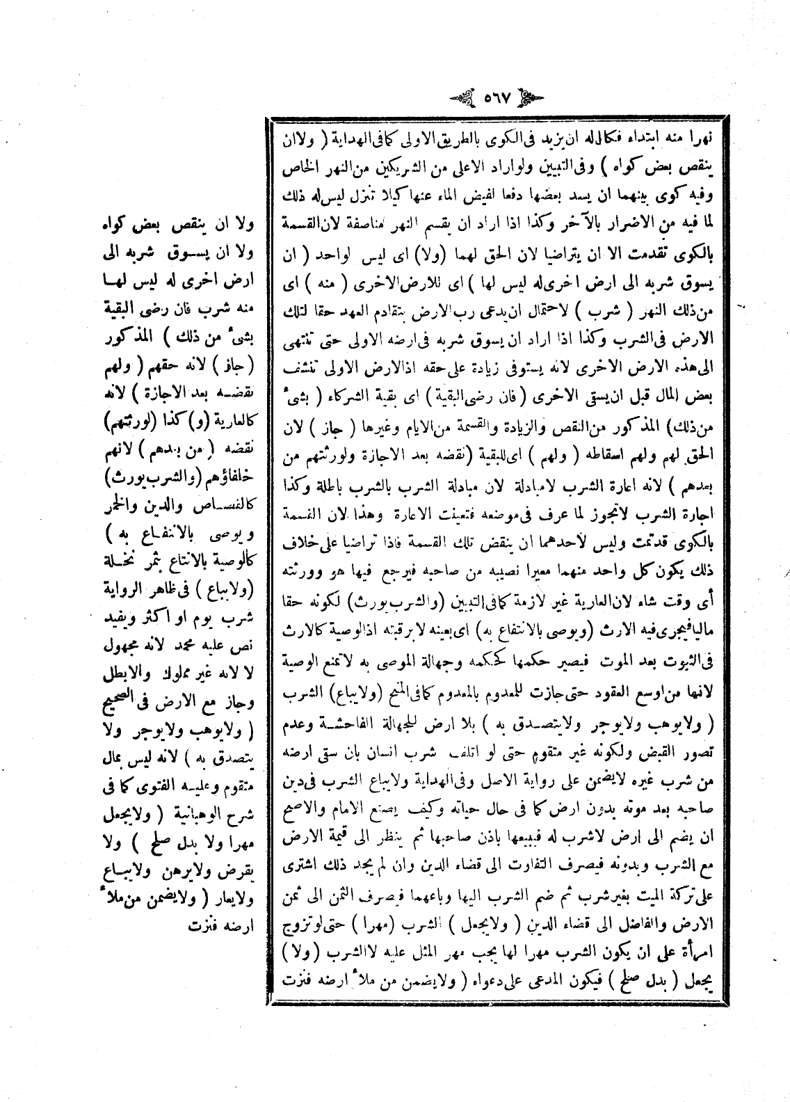 وَفِي التَّبْيِينِ وَلَوْ أَرَادَ الْأَعْلَى مِنْ الشَّرِيكَيْنِ مِنْ النَّهْرِ الْخَاصِّ وَفِيهِ كُوًى بَيْنَهُمَا أَنْ يَسُدَّ بَعْضَهَا دَفْعًا لِفَيْضِ الْمَاءِ عَنْهَا كَيْ لَا تَنْزِلَ لَيْسَ لَهُ ذَلِكَ لِمَا فِيهِ مِنْ الْإِضْرَارِ بِالْآخَرِ وَكَذَا إذَا أَرَادَ أَنْ يَقْسِمَ النَّهْرَ مُنَاصَفَةً لِأَنَّ الْقِسْمَةَ بِالْكِوَى تَقَدَّمَتْ إلَّا أَنْ يَتَرَاضَيَا لِأَنَّ الْحَقَّ لَهُمَا.