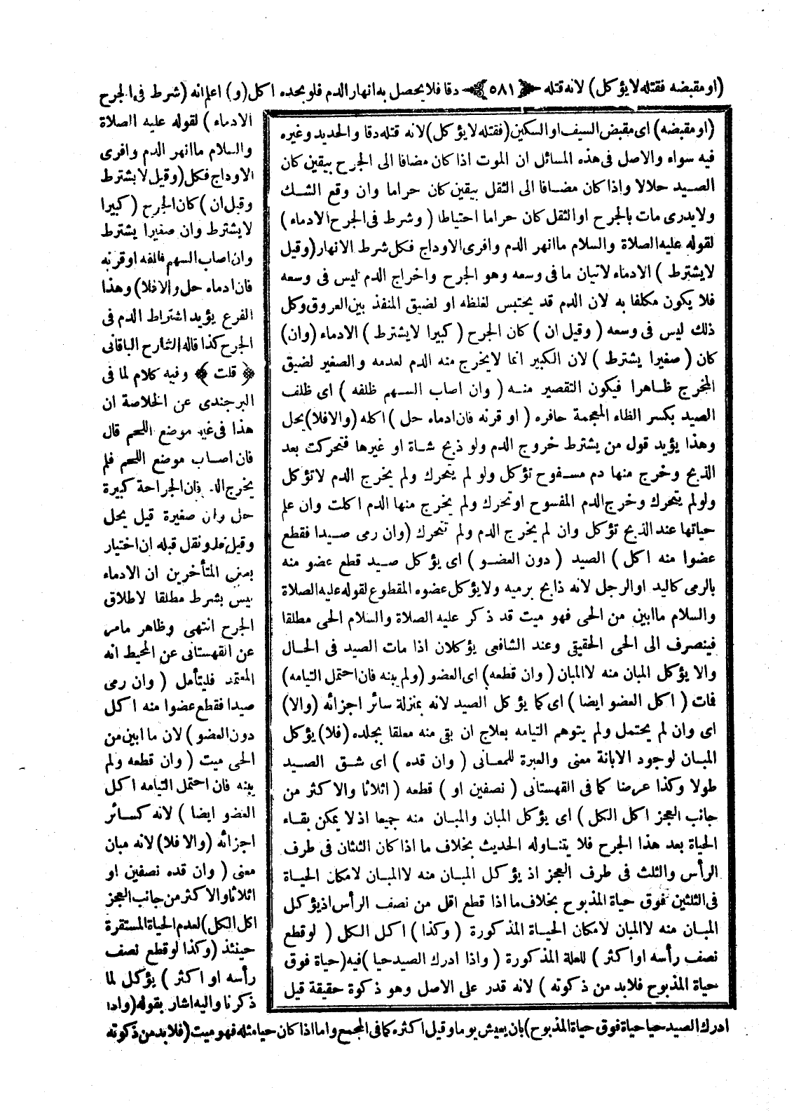(وَشُرِطَ فِي الْجُرْحِ الْإِدْمَاءُ) لِقَوْلِهِ - عَلَيْهِ الصَّلَاةُ وَالسَّلَامُ - «مَا أَنْهَرَ الدَّمَ وَأَفْرَى الْأَوْدَاجَ فَكُلْ» شَرَطَ الْإِنْهَارَ (وَقِيلَ لَا يُشْتَرَطُ) الْإِدْمَاءُ لِإِتْيَانِ مَا فِي وُسْعِهِ وَهُوَ الْجُرْحُ وَإِخْرَاجُ الدَّمِ لَيْسَ فِي وُسْعِهِ فَلَا يَكُونُ مُكَلَّفًا بِهِ لِأَنَّ الدَّمَ قَدْ يَحْتَبِسُ لِغِلَظِهِ أَوْ لِضِيقِ الْمَنْفَذِ بَيْنَ الْعُرُوقِ وَكُلُّ ذَلِكَ لَيْسَ فِي وُسْعِهِ (وَقِيلَ إنْ) كَانَ الْجُرْحُ (كَبِيرًا لَا يُشْتَرَطُ) الْإِدْمَاءُ.