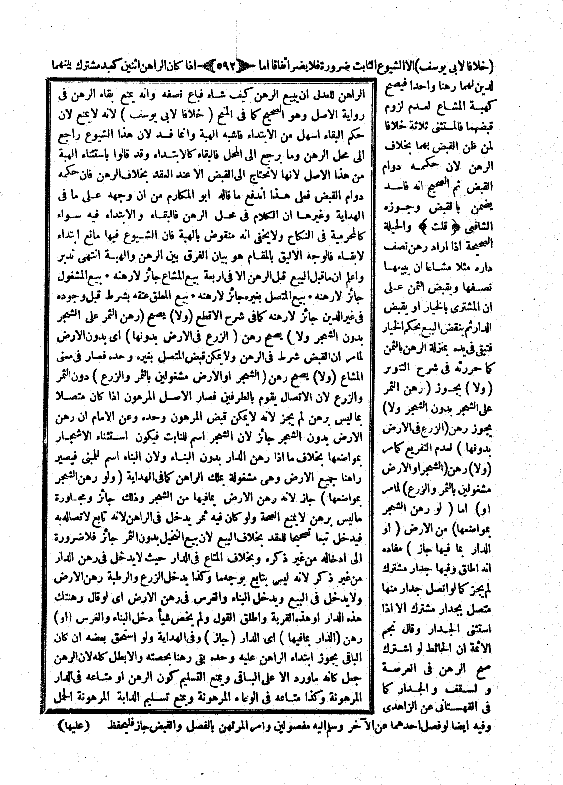 الرَّاهِنُ لِلْعَدْلِ أَنْ يَبِيعَ الرَّهْنَ كَيْفَ شَاءَ فَبَاعَ نِصْفَهُ وَإِنَّهُ يَمْنَعُ بَقَاءَ الرَّهْنِ فِي رِوَايَةِ الْأَصْلِ وَهُوَ الصَّحِيحُ كَمَا فِي الْمِنَحِ (خِلَافًا لِأَبِي يُوسُفَ) لِأَنَّهُ لَا يَمْنَعُ لِأَنَّ حُكْمَ الْبَقَاءِ أَسْهَلُ مِنْ الِابْتِدَاءِ فَأَشْبَهَ الْهِبَةَ وَإِنَّمَا فَسَدَ لِأَنَّ هَذَا الشُّيُوعَ رَاجِعٌ إلَى مَحِلِّ الرَّهْنِ وَمَا يَرْجِعُ إلَى مَحِلٍّ فَالْبَقَاءُ كَالِابْتِدَاءِ وَقَدْ قَالُوا بِاسْتِثْنَاءِ الْهِبَةِ مِنْ هَذَا الْأَصْلِ لِأَنَّهَا لَا تَحْتَاجُ إلَى الْقَبْضِ إلَّا عِنْدَ الْعَقْدِ بِخِلَافِ الرَّهْنِ فَإِنَّ حُكْمَهُ دَوَامُ الْقَبْضِ فَعَلَى هَذَا انْدَفَعَ مَا قَالَهُ أَبُو الْمَكَارِمِ مِنْ أَنْ وَجْهَهُ عَلَى مَا فِي الْهِدَايَةِ وَغَيْرِهَا أَنَّ الْكَلَامَ فِي مَحِلِّ الرَّهْنِ فَالْبَقَاءُ وَالِابْتِدَاءُ فِيهِ سَوَاءٌ كَالْمَحْرَمِيَّةِ فِي النِّكَاحِ وَلَا يَخْفَى أَنَّهُ مَنْقُوضٌ بِالْهِبَةِ فَإِنَّ الشُّيُوعَ فِيهَا مَانِعُ ابْتِدَاءٍ لَا بَقَاءٍ فَالْوَجْهُ الْأَلْيَقُ بِالْمَقَامِ هُوَ بَيَانُ الْفَرْقِ بَيْنَ الرَّهْنِ وَالْهِبَةِ انْتَهَى تَدَبَّرْ وَاعْلَمْ أَنَّ مَا قَبِلَ الْبَيْعَ قَبِلَ الرَّهْنَ إلَّا فِي أَرْبَعَةٍ بَيْعُ الْمُشَاعِ جَائِزٌ لَا رَهْنُهُ بَيْعُ الْمَشْغُولِ جَائِزٌ لَا رَهْنُهُ بَيْعُ الْمُتَّصِلِ بِغَيْرِهِ جَائِزٌ لَا رَهْنُهُ بَيْعُ الْمُعَلَّقِ عِتْقُهُ بِشَرْطٍ قَبْلَ وُجُودِهِ فِي غَيْرِ الدَّيْنِ جَائِزٌ لَا رَهْنُهُ كَمَا فِي شَرْحِ الْأَقْطَعِ.