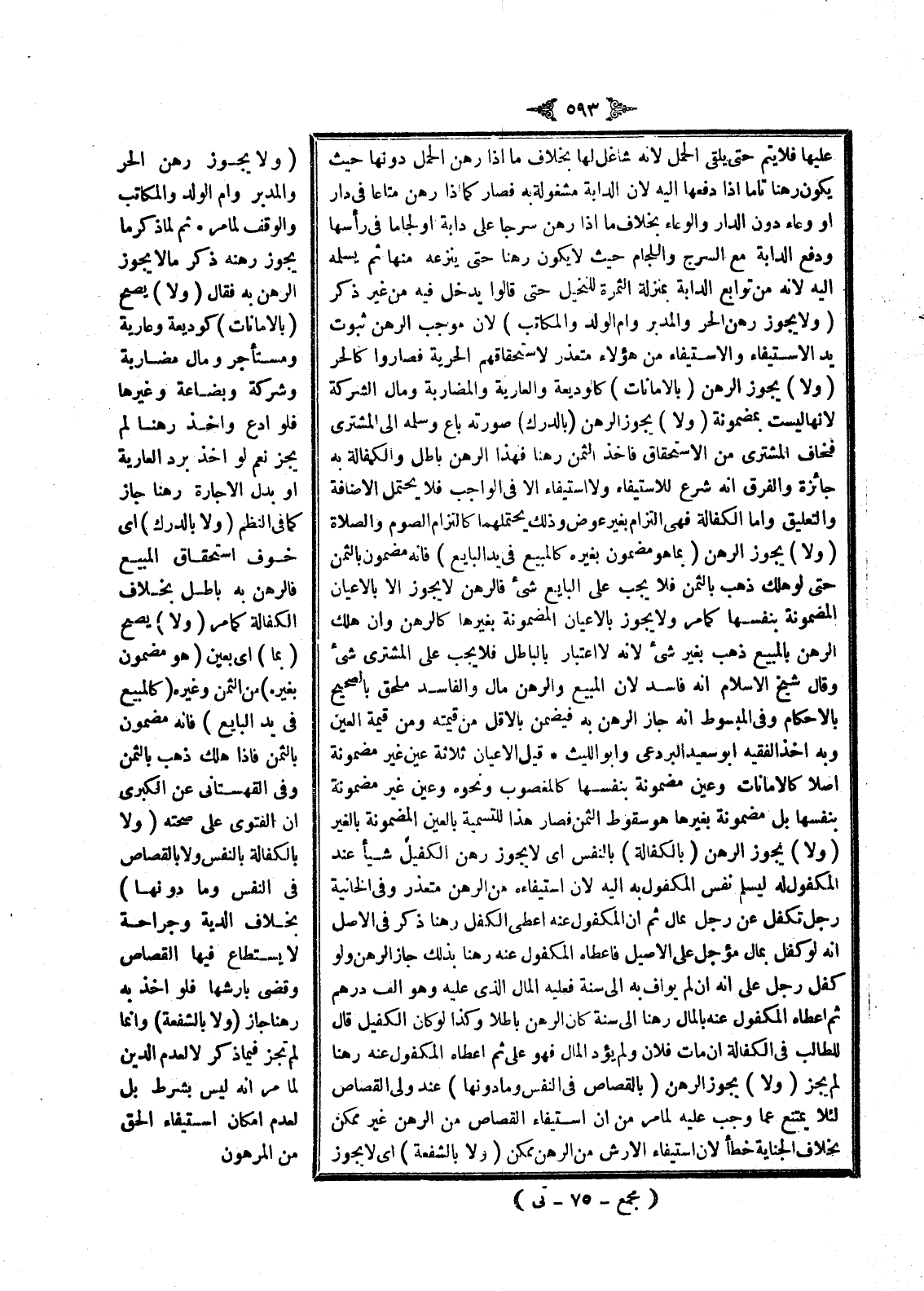 (وَلَا) يَجُوزُ الرَّهْنُ (بِالْقِصَاصِ فِي النَّفْسِ وَمَا دُونَهَا) عِنْدَ وَلِيِّ الْقِصَاصِ لِئَلَّا يَمْتَنِعَ عَمَّا وَجَبَ عَلَيْهِ لِمَا مَرَّ مِنْ أَنَّ اسْتِيفَاءَ الْقِصَاصِ مِنْ الرَّهْنِ غَيْرُ مُمْكِنٍ بِخِلَافِ الْجِنَايَةِ خَطَأً لِأَنَّ اسْتِيفَاءَ الْأَرْشِ مِنْ الرَّهْنِ مُمْكِنٌ.
