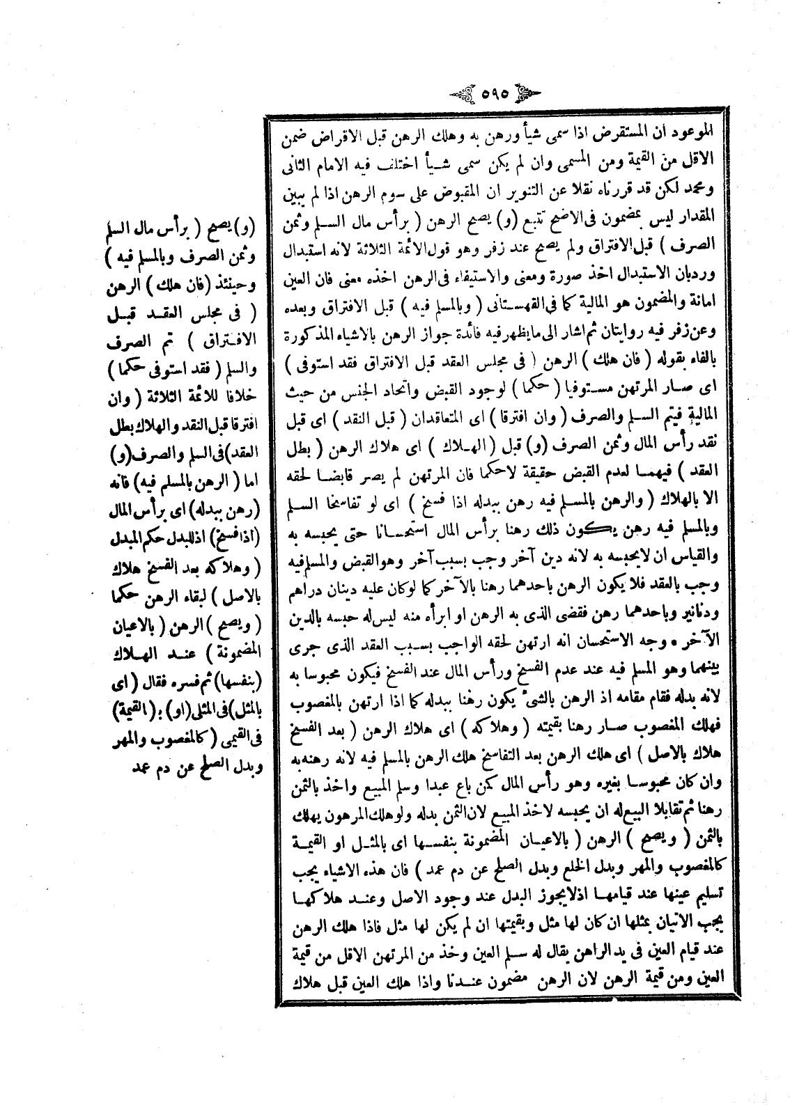 الْمَوْعُودِ أَنَّ الْمُسْتَقْرِضَ إذَا سَمَّى شَيْئًا وَرَهَنَ بِهِ هَلَكَ الرَّهْنُ قَبْلَ الْإِقْرَاضِ ضَمِنَ الْأَقَلَّ مِنْ الْقِيمَةِ وَمِنْ الْمُسَمَّى وَإِنْ لَمْ يَكُنْ سَمَّى شَيْئًا اخْتَلَفَ فِيهِ الْإِمَامُ الثَّانِي وَمُحَمَّدٌ لَكِنْ قَدْ قَرَرْنَاهُ نَقْلًا عَنْ التَّنْوِيرِ أَنَّ الْمَقْبُوضَ عَلَى سَوْمِ الرَّهْنِ إذَا لَمْ يُبَيِّنْ الْمِقْدَارَ لَيْسَ بِمَضْمُونٍ فِي الْأَصَحِّ تَتَبَّعْ.