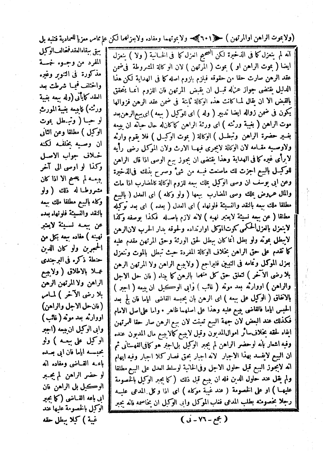 أَنَّهُ لَمْ يَنْعَزِلْ كَمَا فِي الذَّخِيرَةِ لَكِنَّ الصَّحِيحَ انْعَزَلَ كَمَا فِي الْخَانِيَّةِ (وَلَا) يَنْعَزِلُ أَيْضًا (بِمَوْتِ الرَّاهِنِ أَوْ) بِمَوْتِ (الْمُرْتَهِنِ) لِأَنَّ الْوَكَالَةَ الْمَشْرُوطَةَ فِي ضِمْنِ عَقْدِ الرَّهْنِ صَارَتْ حَقًّا مِنْ حُقُوقِهِ فَيَلْزَمُ بِلُزُومِ أَصْلِهِ كَمَا فِي الْهِدَايَةِ لَكِنَّ هَذَا الدَّلِيلَ يَقْتَضِي جَوَازَ عَزْلِهِ قَبْلَ أَنْ يَقْبِضَ الْمُرْتَهِنُ فَإِنَّ اللُّزُومَ إنَّمَا يَتَحَقَّقُ بِالْقَبْضِ إلَّا أَنْ يُقَالَ لَمَّا كَانَتْ هَذِهِ الْوَكَالَةُ ثَابِتَةً فِي ضِمْنِ عَقْدِ الرَّهْنِ فَزَوَالُهَا يَكُونُ فِي ضِمْنِ زَوَالِهِ أَيْضًا تَدَبَّرْ.