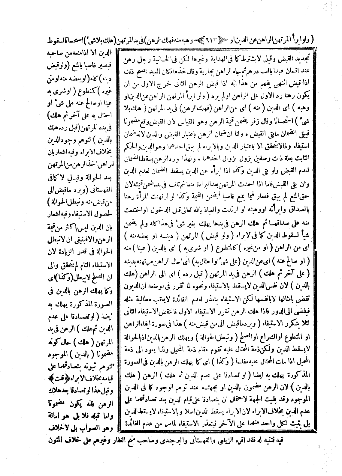 (وَلَوْ أَبْرَأَ الْمُرْتَهِنُ الرَّاهِنَ عَنْ الدَّيْنِ أَوْ وَهَبَهُ) أَيْ الدَّيْنَ (مِنْهُ) أَيْ مِنْ الرَّاهِنِ (فَهَلَكَ الرَّهْنُ) فِي يَدِ الْمُرْتَهِنِ (هَلَكَ بِلَا شَيْءٍ) اسْتِحْسَانًا.