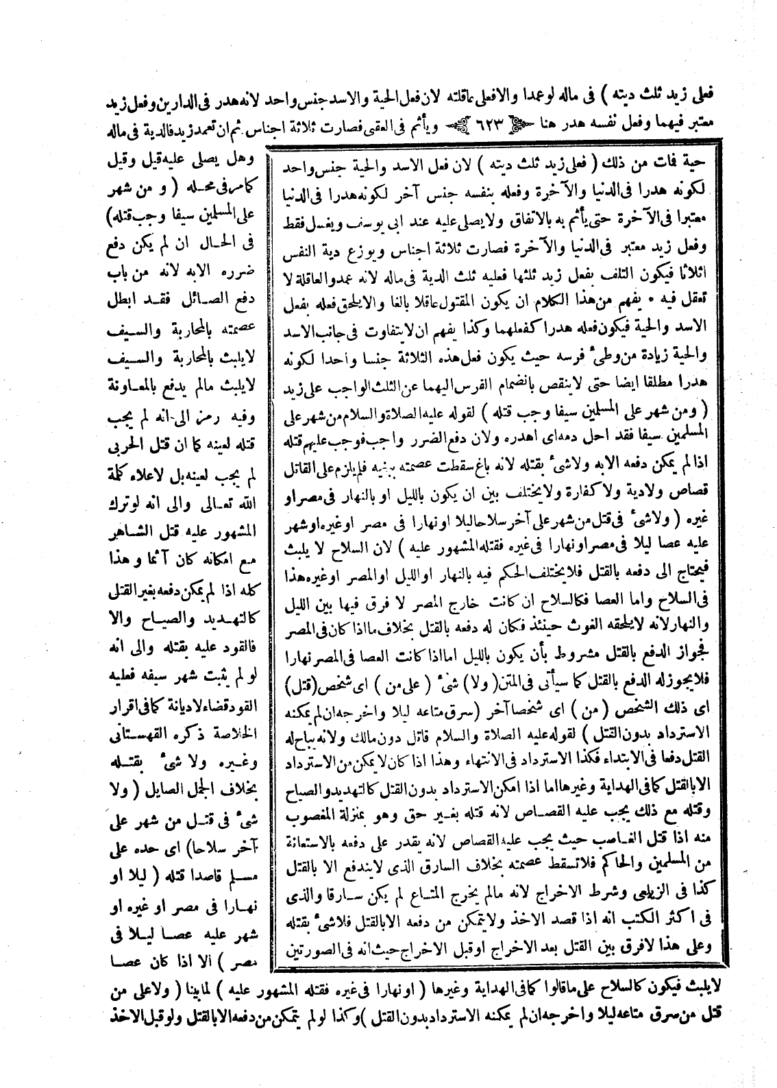 حَيَّةٌ فَمَاتَ مِنْ ذَلِكَ (فَعَلَى زَيْدٍ ثُلُثُ دِيَتِهِ) لِأَنَّ فِعْلَ الْأَسَدِ وَالْحَيَّةِ جِنْسٌ وَاحِدٌ لِكَوْنِهِ هَدَرًا فِي الدُّنْيَا وَالْآخِرَةِ وَفِعْلُهُ بِنَفْسِهِ جِنْسٌ آخَرُ لِكَوْنِهِ هَدَرًا فِي الدُّنْيَا مُعْتَبَرًا فِي الْآخِرَةِ حَتَّى يَأْثَمَ بِهِ بِالِاتِّفَاقِ وَلَا يُصَلَّى عَلَيْهِ عِنْدَ أَبِي يُوسُفَ وَيُغَسَّلُ فَقَطْ وَفِعْلُ زَيْدٍ مُعْتَبَرٌ فِي الدُّنْيَا وَالْآخِرَةِ فَصَارَتْ ثَلَاثَةَ أَجْنَاسٍ وَيُوَزِّعُ دِيَةَ النَّفْسِ أَثْلَاثًا فَيَكُونُ التَّلَفُ زَيْدٌ ثُلُثُهَا فَعَلَيْهِ ثُلُثُ الدِّيَةِ فِي مَالِهِ لِأَنَّهُ عَمْدٌ وَالْعَاقِلَةُ لَا تَعْقِلُ فِيهِ يُفْهَمُ مِنْ هَذَا الْكَلَامِ أَنْ يَكُونَ الْمَقْتُولُ عَاقِلًا بَالِغًا وَإِلَّا يَلْحَقُ فِعْلُهُ بِفِعْلِ الْأَسَدِ وَالْحَيَّةِ فَيَكُونُ فِعْلُهُ هَدَرًا كَفِعْلِهِمَا وَكَذَا يُفْهَمُ أَنْ لَا يَتَفَاوَتَ فِي جَانِبِ الْأَسَدِ وَالْحَيَّةِ زِيَادَةُ مِنْ وَطِئَ فَرَسَهُ حَيْثُ يَكُونُ فِعْلُ هَذِهِ الثَّلَاثَةِ جِنْسًا وَاحِدًا لِكَوْنِهِ هَدَرًا مُطْلَقًا أَيْضًا حَتَّى لَا يَنْقُصَ بِانْضِمَامِ الْفَرَسِ إلَيْهِمَا عَنْ الثُّلُثِ الْوَاجِبِ عَلَى زَيْدٍ.