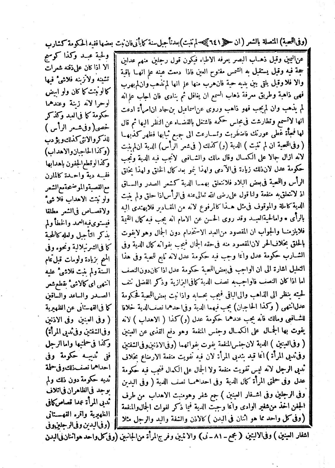 وَقَالَ مَالِكٌ وَالشَّافِعِيُّ: لَا تَجِبُ فِيهِ الدِّيَةُ وَتَجِبُ حُكُومَةُ عَدْلٍ لِأَنَّ ذَلِكَ زِيَادَةٌ فِي الْآدَمِيِّ وَلِهَذَا يَنْمُو بَعْدَ كَمَالِ الْخَلْقِ وَلِهَذَا يَحْلِقُ الرَّأْسَ وَاللِّحْيَةَ فِي بَعْضِ الْبِلَادِ فَلَا تَتَعَلَّقُ بِهِمَا الدِّيَةُ كَشَعْرِ الصَّدْرِ وَالسَّاقِ إذْ لَا تَتَعَلَّقُ بِهِ مَنْفَعَةٌ وَلَنَا قَوْلُ عَلِيٍّ - رَضِيَ اللَّهُ تَعَالَى عَنْهُ - فِي الرَّأْسِ إذَا حُلِقَ وَلَمْ يَنْبُتْ الدِّيَةُ كَامِلَةٌ وَالْمَوْقُوفُ فِي مِثْلِ هَذَا كَالْمَرْفُوعِ لِأَنَّهُ مِنْ الْمَقَادِيرِ فَلَا يُهْتَدَى إلَيْهِ بِالرَّأْيِ وَأَمَّا لِحْيَةُ الْعَبْدِ وَقَدْ رَوَى الْحَسَنُ عَنْ الْإِمَامِ أَنَّهُ يَجِبُ فِيهِ كَمَالُ الْقِيمَةِ فَلَا يَلْزَمُنَا وَالْجَوَابُ أَنَّ الْمَقْصُودَ مِنْ الْعَبْدِ الِاسْتِخْدَامُ دُونَ الْجَمَالِ وَهُوَ لَا يَفُوتُ بِالْحَلْقِ بِخِلَافِ الْحُرِّ لِأَنَّ الْمَقْصُودَ مِنْهُ فِي حَقِّهِ الْجَمَالُ فَيَجِبُ بِفَوَاتِهِ كَمَالُ الدِّيَةِ وَفِي الشَّارِبِ حُكُومَةُ عَدْلٍ وَإِنَّمَا وَجَبَ فِيهِ حُكُومَةُ عَدْلٍ لِأَنَّهُ تَابِعٌ لِلِّحْيَةِ وَفِي هَذَا التَّعْلِيلِ إشَارَةٌ إلَى أَنَّ الْوَاجِبَ فِي بَعْضِ اللِّحْيَةِ حُكُومَةُ عَدْلٍ إذَا كَانَ دُونَ النِّصْفِ أَمَّا إذَا كَانَ النِّصْفُ فَالْوَاجِبُ بِهِ نِصْفُ الدِّيَةِ كَمَا فِي الْبَزَّازِيَّةِ وَذَكَرَ الْفَضْلِيُّ نَتْفُ لِحْيَتِهِ يُنْظَرُ إلَى الذَّاهِبِ وَإِلَى الْبَاقِي فَيَجِبُ بِحِسَابِهِ وَإِذَا نَبَتَ بَعْضُ اللِّحْيَةِ فَحُكُومَةُ عَدْلٍ انْتَهَى.
