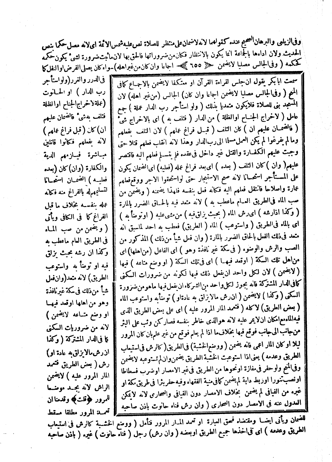 (وَإِنْ فَعَلَ شَيْئًا مِنْ ذَلِكَ) الْمَذْكُورِ مِنْ الصَّبِّ وَالرَّشِّ وَالْوُضُوءِ (فِي سِكَّةٍ غَيْرِ نَافِذَةٍ وَهُوَ) أَيْ الْفَاعِلُ (مِنْ أَهْلِهَا) أَيْ مِنْ أَهْلِ تِلْكَ السِّكَّةِ (أَوْ قَعَدَ فِيهَا) أَيْ فِي تِلْكَ السِّكَّةِ (أَوْ وَضَعَ مَتَاعَهُ) فِيهَا (لَا يَضْمَنُ) لِأَنَّ لِكُلِّ وَاحِدٍ أَنْ يَفْعَلَ ذَلِكَ فِيهَا لِكَوْنِهِ مِنْ ضَرُورَاتِ السُّكْنَى كَمَا فِي الدَّارِ الْمُشْتَرَكَةِ فَإِنَّهُ يَجُوزُ لِكُلِّ وَاحِدٍ مِنْ الشُّرَكَاءِ أَنْ يَفْعَلَ فِيهَا مَا هُوَ مِنْ ضَرُورَةِ السُّكْنَى.