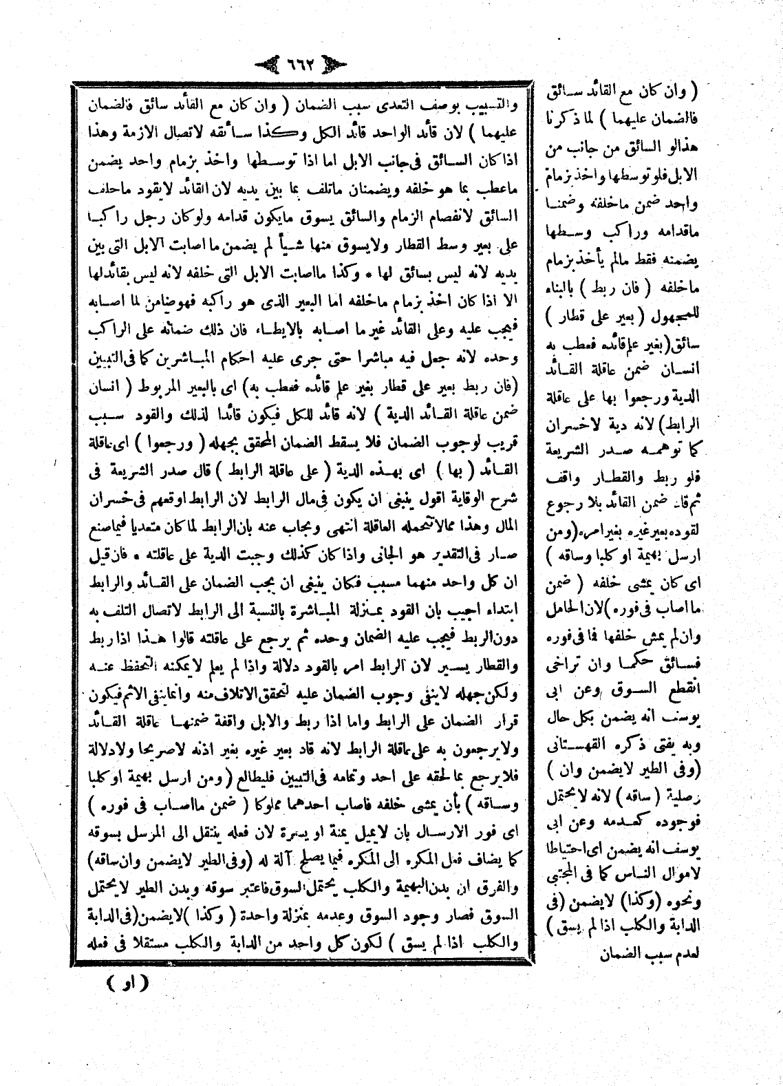 (وَإِنْ كَانَ مَعَ الْقَائِدِ سَائِقٌ فَالضَّمَانُ عَلَيْهِمَا) لِأَنَّ قَائِدَ الْوَاحِدِ قَائِدُ الْكُلِّ وَكَذَا سَائِقُهُ لِاتِّصَالِ الْأَزِمَّةِ وَهَذَا إذَا كَانَ السَّائِقُ فِي جَانِبِ الْإِبِلِ أَمَّا إذَا تَوَسَّطَهَا وَأَخَذَ بِزِمَامِ وَاحِدٍ يَضْمَنُ مَا عَطِبَ بِمَا هُوَ خَلْفَهُ وَيَضْمَنَانِ مَا تَلِفَ بِمَا بَيْنَ يَدَيْهِ لِأَنَّ الْقَائِدَ لَا يَقُودُ مَا خَلْفَ السَّائِقِ لِانْفِصَامِ الزِّمَامِ وَالسَّائِقُ يَسُوقُ مَا يَكُونُ قُدَّامَهُ وَلَوْ كَانَ رَجُلٌ رَاكِبًا عَلَى بَعِيرٍ وَسَطَ الْقِطَارِ وَلَا يَسُوقُ مِنْهَا شَيْئًا لَمْ يَضْمَنْ مَا أَصَابَتْ الْإِبِلُ الَّتِي بَيْنَ يَدَيْهِ لِأَنَّهُ لَيْسَ بِسَائِقٍ لَهَا وَكَذَا مَا أَصَابَتْ الْإِبِلُ الَّتِي خَلْفَهُ لِأَنَّهُ لَيْسَ بِقَائِدٍ لَهَا إلَّا إذَا كَانَ أَخَذَ بِزِمَامِ مَا خَلْفَهُ أَمَّا الْبَعِيرُ الَّذِي هُوَ رَاكِبُهُ فَهُوَ ضَامِنٌ لِمَا أَصَابَهُ فَيَجِبُ عَلَيْهِ وَعَلَى الْقَائِدِ غَيْرُ مَا أَصَابَهُ بِالْإِيطَاءِ فَإِنَّ ذَلِكَ ضَمَانُهُ عَلَى الرَّاكِبِ وَحْدَهُ لِأَنَّهُ جُعِلَ فِيهِ مُبَاشِرًا حَتَّى جَرَى عَلَيْهِ أَحْكَامُ الْمُبَاشِرِينَ كَمَا فِي التَّبْيِينِ.