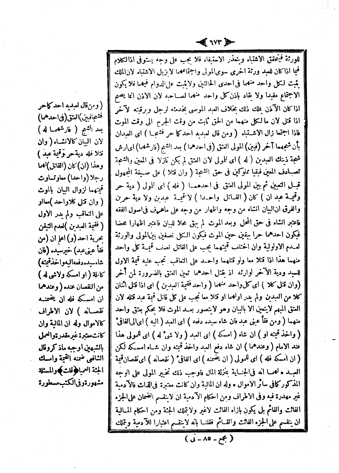(وَمَنْ قَالَ لِعَبْدَيْهِ: أَحَدُكُمَا حُرٌّ فَشُجَّا) أَيْ الْعَبْدَانِ بِأَنْ شَجَّهُمَا آخَرُ (فَبَيَّنَ) الْمَوْلَى الْعِتْقَ (فِي أَحَدِهِمَا) بَعْدَ الشَّجِّ (فَأَرْشُهُمَا) أَيْ أَرْشُ شَجَّةِ ذَيْنِك الْعَبْدَيْنِ (لَهُ) أَيْ لِلْمَوْلَى لِأَنَّ الْعِتْقَ لَمْ يَكُنْ نَازِلًا فِي الْمُعَيَّنِ وَالشَّجَّةُ تُصَادِفُ الْمُعَيَّنَ فَبَقِيَا مَمْلُوكَيْنِ فِي حَقِّ الشَّجَّةِ.