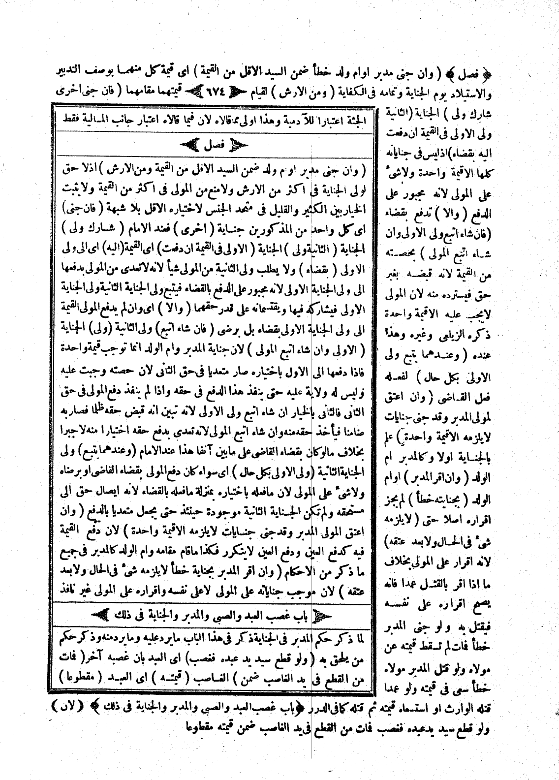 فَصَلِّ (وَإِنْ جَنَى مُدَبَّرٌ أَوْ أُمُّ وَلَدٍ ضَمِنَ السَّيِّدُ الْأَقَلَّ مِنْ الْقِيمَةِ وَمِنْ الْأَرْشِ) إذْ لَا حَقَّ لِوَلِيِّ الْجِنَايَةِ فِي أَكْثَرَ مِنْ الْأَرْشِ وَلَا مَنْعَ مِنْ الْمَوْلَى فِي أَكْثَرَ مِنْ الْقِيمَةِ وَلَا يَثْبُتُ الْخِيَارُ بَيْنَ الْكَثِيرِ وَالْقَلِيلِ فِي مُتَّحِدِ الْجِنْسِ لِاخْتِيَارِهِ الْأَقَلَّ بِلَا شُبْهَةٍ (فَإِنْ جَنَى) أَيْ كُلُّ وَاحِدٍ مِنْ الْمَذْكُورَيْنِ جِنَايَةً (أُخْرَى) فَعِنْدَ الْإِمَامِ (شَارَكَ وَلِيُّ) الْجِنَايَةِ (الثَّانِيَةِ وَلِيَّ) الْجِنَايَةِ (الْأُولَى فِي الْقِيمَةِ إنْ دُفِعَتْ) أَيْ الْقِيمَةُ (إلَيْهِ) أَيْ إلَى وَلِيِّ الْأُولَى (بِقَضَاءٍ) وَلَا يَطْلُبُ وَلِيُّ الثَّانِيَةِ مِنْ الْمَوْلَى شَيْئًا لِأَنَّهُ لَا تَعَدِّي مِنْ الْمَوْلَى بِدَفْعِهَا إلَى وَلِيِّ الْجِنَايَةِ الْأُولَى لِأَنَّهُ مَجْبُورٌ عَلَى الدَّفْعِ بِالْقَضَاءِ فَيَتْبَعُ وَلِيُّ الْجِنَايَةِ الثَّانِيَةِ وَلِيَّ الْجِنَايَةِ الْأُولَى فَيُشَارِكُهُ فِيهَا وَيَقْتَسِمَانِهِ عَلَى قَدْرِ حَقِّهِمَا (وَإِلَّا) أَيْ وَإِنْ لَمْ يَدْفَعْ الْمَوْلَى الْقِيمَةَ إلَى وَلِيِّ الْجِنَايَةِ الْأُولَى بِقَضَاءٍ بَلْ بِرِضًى (فَإِنْ شَاءَ اتَّبَعَ) وَلِيُّ الثَّانِيَةِ (وَلِيَّ) الْجِنَايَةِ (الْأُولَى وَإِنْ شَاءَ اتَّبَعَ الْمَوْلَى) لِأَنَّ جِنَايَةَ الْمُدَبَّرِ وَأُمِّ الْوَلَدِ إنَّمَا تُوجِبُ قِيمَةً وَاحِدَةً فَإِذَا دَفَعَهَا إلَى الْأَوَّلِ بِاخْتِيَارِهِ صَارَ مُتَعَدِّيًا فِي حَقِّ الثَّانِي لِأَنَّ حِصَّتَهُ وَجَبَتْ عَلَيْهِ وَلَيْسَ لَهُ وِلَايَةٌ عَلَيْهِ حَتَّى يَنْفُذَ هَذَا الدَّفْعُ فِي حَقِّهِ وَإِذَا لَمْ يَنْفُذْ دَفَعَ الْمَوْلَى فِي حَقِّ الثَّانِي فَالثَّانِي بِالْخِيَارِ إنْ شَاءَ اتَّبَعَ وَلِيَّ الْأَوَّلِ لِأَنَّهُ تَبَيَّنَ أَنَّهُ قَبَضَ حَقَّهُ ظُلْمًا فَصَارَ بِهِ ضَامِنًا فَيَأْخُذُ حَقَّهُ مِنْهُ وَإِنْ شَاءَ اتَّبَعَ الْمَوْلَى لِأَنَّهُ تَعَدَّى بِدَفْعِ حَقِّهِ اخْتِيَارًا مِنْهُ لَا جَبْرًا بِخِلَافِ مَا لَوْ كَانَ بِقَضَاءِ الْقَاضِي عَلَى مَا بُيِّنَ آنِفًا هَذَا عِنْدَ الْإِمَامِ (وَعِنْدَهُمَا يَتْبَعُ) وَلِيُّ الْجِنَايَةِ الثَّانِيَةِ (وَلِيَّ الْأُولَى بِكُلِّ حَالٍ) أَيْ سَوَاءٌ كَانَ دَفَعَ الْمَوْلَى بِقَضَاءِ الْقَاضِي أَوْ بِرِضَاهُ وَلَا شَيْءَ عَلَى الْمَوْلَى لِأَنَّ مَا فَعَلَهُ بِاخْتِيَارِهِ بِمَنْزِلَةِ مَا فَعَلَهُ بِالْقَضَاءِ لِأَنَّهُ إيصَالُ حَقٍّ إلَى مُسْتَحِقِّهِ وَلَمْ تَكُنْ الْجِنَايَةُ الثَّانِيَةُ مَوْجُودَةً حِينَئِذٍ حَتَّى يُجْعَلَ مُتَعَدِّيًا بِالدَّفْعِ.