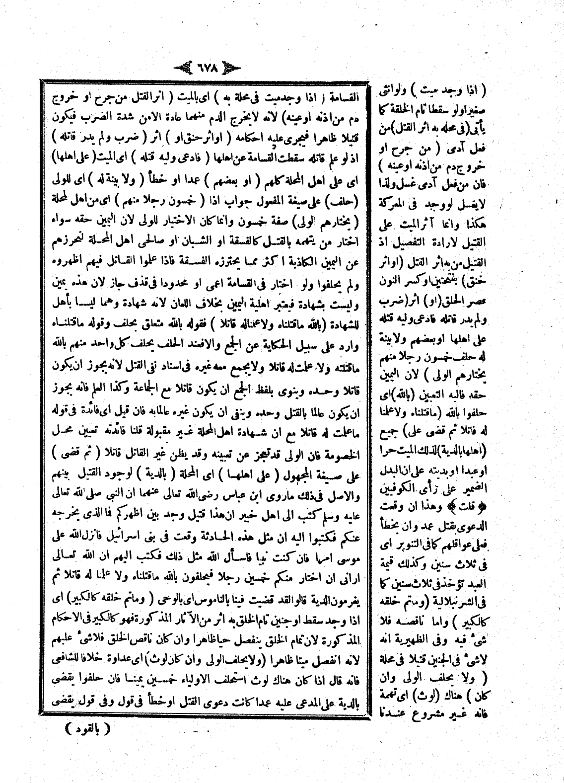 (إذَا) (وُجِدَ مَيِّتٌ فِي مَحَلَّةٍ بِهِ) أَيْ بِالْمَيِّتِ (أَثَرُ الْقَتْلِ مِنْ جُرْحٍ أَوْ خُرُوجِ دَمٍ مِنْ أُذُنِهِ أَوْ عَيْنِهِ) ؛ لِأَنَّهُ لَا يَخْرُجُ الدَّمُ مِنْهُمَا عَادَةً إلَّا مِنْ شِدَّةِ الضَّرْبِ فَيَكُونُ قَتِيلًا ظَاهِرًا فَيُجْرَى عَلَيْهِ أَحْكَامُهُ (أَوْ أَثَرُ خَنْقٍ أَوْ) أَثَرُ (ضَرْبٍ وَلَمْ يُدْرَ قَاتِلُهُ) إذْ لَوْ عُلِمَ قَاتِلُهُ سَقَطَتْ الْقَسَامَةُ عَنْ أَهْلِهَا (فَادَّعَى وَلِيُّهُ قَتْلَهُ) أَيْ الْمَيِّتِ (عَلَى أَهْلِهَا) أَيْ عَلَى أَهْلِ الْمَحَلَّةِ كُلِّهِمْ (أَوْ بَعْضِهِمْ) عَمْدًا أَوْ خَطَأً (وَلَا بَيِّنَةَ لَهُ) أَيْ لِلْوَلِيِّ (حُلِّفَ) عَلَى صِيغَةِ الْمَفْعُولِ جَوَابُ إذَا (خَمْسُونَ رَجُلًا مِنْهُمْ) أَيْ مِنْ أَهْلِ الْمَحَلَّةِ (يَخْتَارُهُمْ الْوَلِيُّ) صِفَةُ خَمْسُونَ وَإِنَّمَا كَانَ الِاخْتِيَارُ لِلْوَلِيِّ؛ لِأَنَّ الْيَمِينَ حَقُّهُ سَوَاءٌ اخْتَارَ مَنْ يَتَّهِمُهُ بِالْقَتْلِ كَالْفَسَقَةِ أَوْ الشُّبَّانِ أَوْ صَالِحِي أَهْلِ الْمَحَلَّةِ لِتَحَرُّزِهِمْ عَنْ الْيَمِينِ الْكَاذِبَةِ أَكْثَرَ مِمَّا يَحْتَرِزُهُ الْفَسَقَةُ، فَإِذَا عَلِمُوا الْقَاتِلَ فِيهِمْ أَظْهَرُوهُ وَلَمْ يَحْلِفُوا.