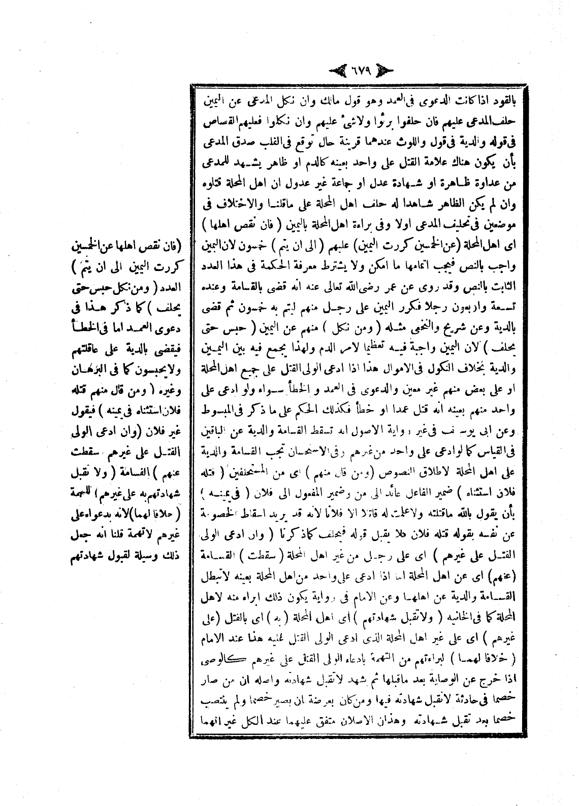 بِالْقَوَدِ إذَا كَانَتْ الدَّعْوَى فِي الْعَمْدِ وَهُوَ قَوْلُ مَالِكٍ وَإِنْ نَكَلَ الْمُدَّعِي عَنْ الْيَمِينِ حُلِّفَ الْمُدَّعَى عَلَيْهِمْ، فَإِنْ حَلَفُوا بَرِئُوا وَلَا شَيْءَ عَلَيْهِمْ، وَإِنْ نَكَلُوا فَعَلَيْهِمْ الْقِصَاصُ فِي قَوْلِهِ وَالدِّيَةُ فِي قَوْلٍ، وَاللَّوْثُ عِنْدَهُمَا قَرِينَةُ حَالٍ تُوقِعُ فِي الْقَلْبِ صِدْقَ الْمُدَّعِي بِأَنْ يَكُونَ هُنَاكَ عَلَامَةُ الْقَتْلِ عَلَى وَاحِدٍ بِعَيْنِهِ كَالدَّمِ أَوْ ظَاهِرٌ يَشْهَدُ لِلْمُدَّعِي مِنْ عَدَاوَةٍ ظَاهِرَةٍ أَوْ شَهَادَةِ عَدْلٍ أَوْ جَمَاعَةٍ غَيْرِ عُدُولٍ أَنَّ أَهْلَ الْمَحَلَّةِ قَتَلُوهُ، وَإِنْ لَمْ يَكُنْ الظَّاهِرُ شَاهِدًا لَهُ حُلِّفَ أَهْلُ الْمَحَلَّةِ عَلَى مَا قُلْنَا وَالِاخْتِلَافُ فِي مَوْضِعَيْنِ فِي تَحْلِيفِ الْمُدَّعِي أَوَّلًا وَفِي بَرَاءَةِ أَهْلِ الْمَحَلَّةِ بِالْيَمِينِ (فَإِنْ نَقَصَ أَهْلُهَا) أَيْ أَهْلُ الْمَحَلَّةِ (عَنْ الْخَمْسِينَ كُرِّرَتْ الْيَمِينُ) عَلَيْهِمْ (إلَى أَنْ يَتِمَّ) خَمْسُونَ؛ لِأَنَّ الْيَمِينَ وَاجِبٌ بِالنَّصِّ فَيَجِبُ إتْمَامُهَا مَا أَمْكَنَ، وَلَا يُشْتَرَطُ مَعْرِفَةُ الْحِكْمَةِ فِي هَذَا الْعَدَدِ الثَّابِتِ بِالنَّصِّ وَقَدْ رُوِيَ عَنْ عُمَرَ - رَضِيَ اللَّهُ تَعَالَى عَنْهُ - أَنَّهُ قَضَى بِالْقَسَامَةِ وَعِنْدَهُ تِسْعَةٌ وَأَرْبَعُونَ رَجُلًا فَكَرَّرَ الْيَمِينَ عَلَى رَجُلٍ مِنْهُمْ لِيَتِمَّ بِهِ خَمْسُونَ ثُمَّ قَضَى بِالدِّيَةِ وَعَنْ شُرَيْحٍ وَالنَّخَعِيِّ مِثْلُهُ (وَمَنْ نَكَلَ) مِنْهُمْ عَنْ الْيَمِينِ (حُبِسَ حَتَّى يَحْلِفَ) ؛ لِأَنَّ الْيَمِينَ وَاجِبَةٌ فِيهِ تَعْظِيمًا لِأَمْرِ الدَّمِ وَلِهَذَا يُجْمَعُ فِيهِ بَيْنَ الْيَمِينِ وَالدِّيَةِ بِخِلَافِ النُّكُولِ فِي الْأَمْوَالِ. هَذَا إذَا ادَّعَى الْوَلِيُّ الْقَتْلَ عَلَى جَمِيعِ أَهْلِ الْمَحَلَّةِ أَوْ عَلَى بَعْضٍ مِنْهُمْ غَيْرِ مُعَيَّنٍ وَالدَّعْوَى فِي الْعَمْدِ وَالْخَطَأِ سَوَاءٌ، وَلَوْ ادَّعَى عَلَى وَاحِدٍ مِنْهُمْ بِعَيْنِهِ أَنَّهُ قَتَلَ عَمْدًا أَوْ خَطَأً فَكَذَلِكَ الْحُكْمُ عَلَى مَا ذُكِرَ فِي الْمَبْسُوطِ وَعَنْ أَبِي يُوسُفَ فِي غَيْرِ رِوَايَةِ الْأُصُولِ أَنَّهُ تَسْقُطُ الْقَسَامَةُ وَالدِّيَةُ عَنْ الْبَاقِينَ فِي الْقِيَاسِ كَمَا لَوْ ادَّعَى عَلَى وَاحِدٍ مِنْ غَيْرِهِمْ.