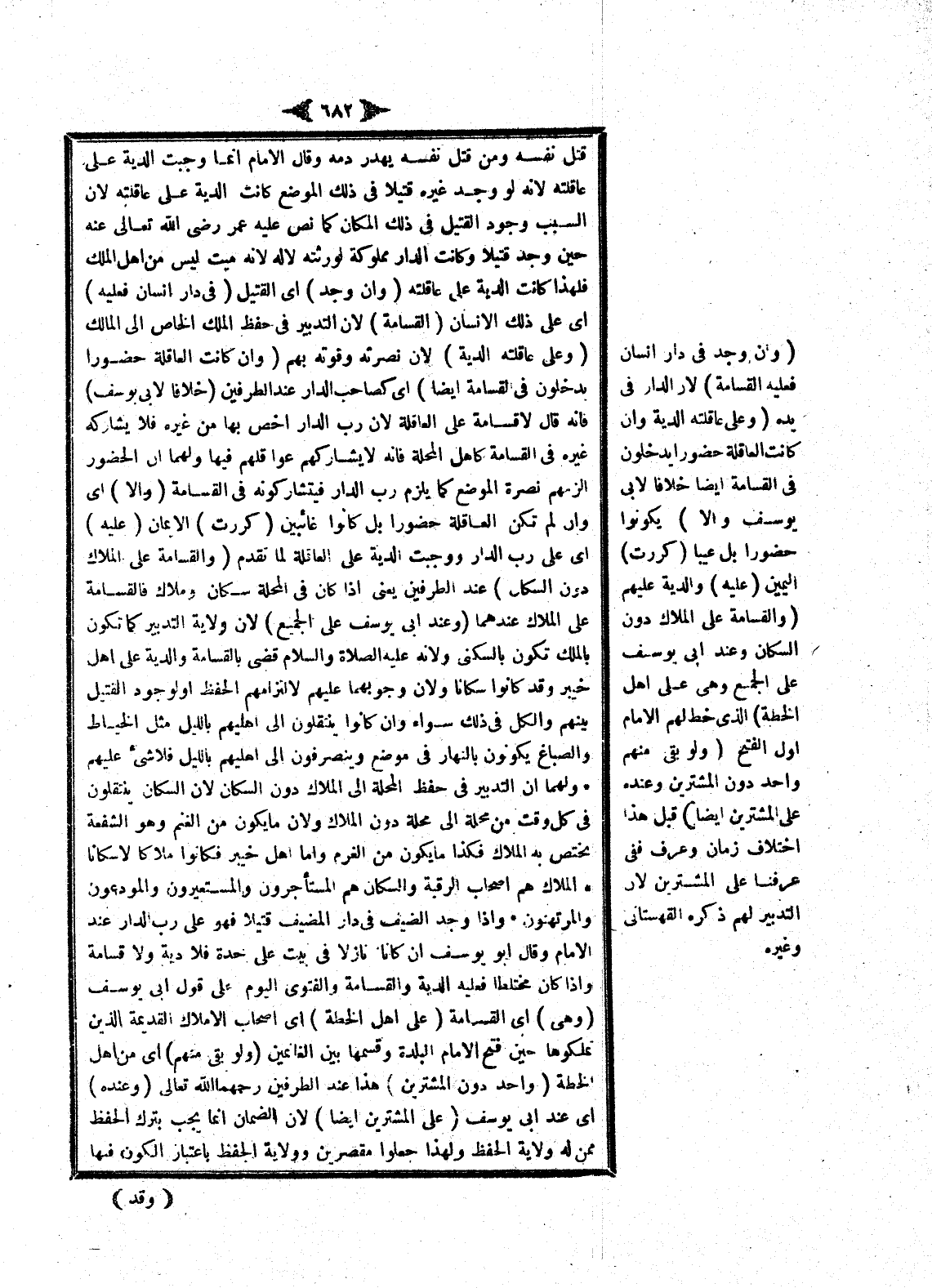 (وَإِنْ كَانَتْ الْعَاقِلَةُ حُضُورًا يَدْخُلُونَ فِي الْقَسَامَةِ أَيْضًا) أَيْ كَصَاحِبِ الدَّارِ عِنْدَ الطَّرَفَيْنِ (خِلَافًا لِأَبِي يُوسُفَ) فَإِنَّهُ قَالَ لَا قَسَامَةَ عَلَى الْعَاقِلَةِ؛ لِأَنَّ رَبَّ الدَّارِ أَخَصُّ بِهَا مِنْ غَيْرِهِ فَلَا يُشَارِكُهُ غَيْرُهُ فِي الْقَسَامَةِ كَأَهْلِ الْمَحَلَّةِ فَإِنَّهُ لَا يُشَارِكُهُمْ عَوَاقِلُهُمْ فِيهَا وَلَهُمَا أَنَّ الْحُضُورَ أَلْزَمَهُمْ نُصْرَةَ الْمَوْضِعِ كَمَا يَلْزَمُ رَبَّ الدَّارِ فَيَتَشَارَكُونَهُ فِي الْقَسَامَةِ (وَإِلَّا) أَيْ وَإِنْ لَمْ تَكُنْ الْعَاقِلَةُ حُضُورًا بَلْ كَانُوا غَائِبِينَ (كُرِّرَتْ) الْأَيْمَانُ (عَلَيْهِ) أَيْ عَلَى رَبِّ الدَّارِ وَوَجَبَتْ الدِّيَةُ عَلَى الْعَاقِلَةِ لِمَا تَقَدَّمَ.