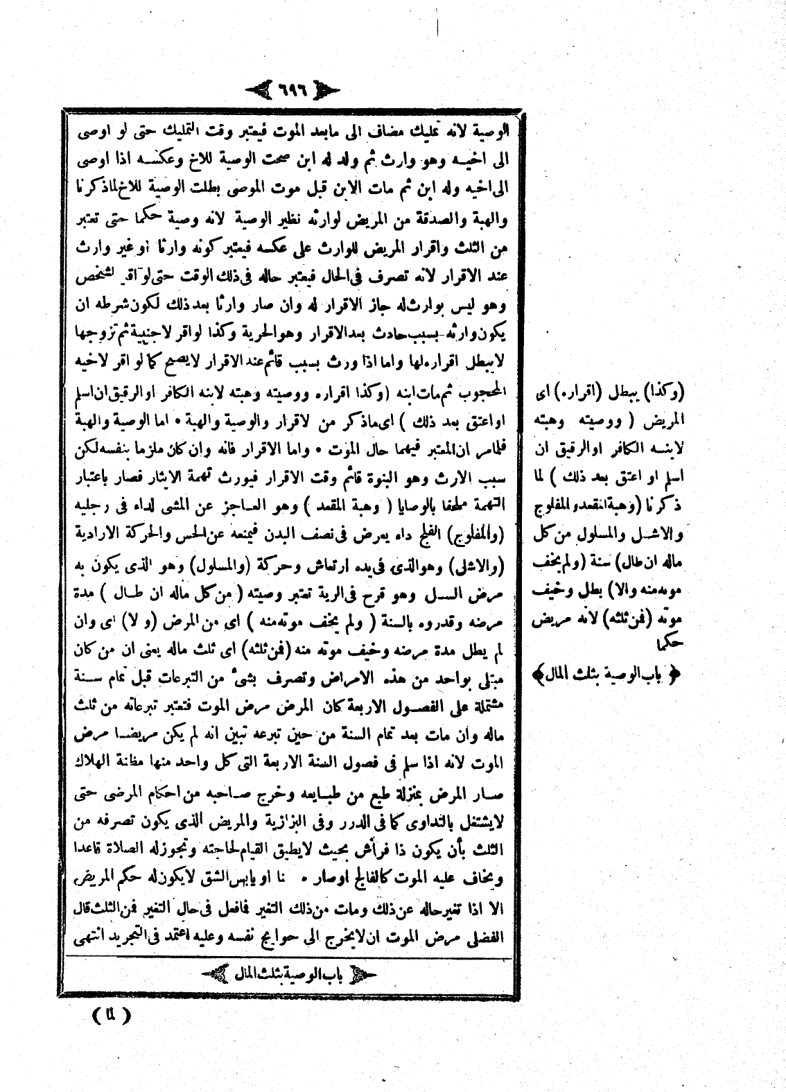 وَفِي الْبَزَّازِيَّةِ وَالْمَرِيضُ الَّذِي يَكُونُ تَصَرُّفُهُ مِنْ الثُّلُثِ بِأَنْ يَكُونَ ذَا فِرَاشٍ بِحَيْثُ لَا يُطِيقُ الْقِيَامَ لِحَاجَتِهِ وَتَجُوزُ لَهُ الصَّلَاةُ قَاعِدًا وَيُخَافُ عَلَيْهِ الْمَوْتُ كَالْفَالِجِ أَوْ صَارَ خَشِنًا أَوْ يَابِسَ الشِّقِّ لَا يَكُونُ لَهُ حُكْمُ الْمَرِيضِ إلَّا إذَا تَغَيَّرَ حَالُهُ عَنْ ذَلِكَ وَمَاتَ مِنْ ذَلِكَ التَّغَيُّرِ فَمَا فَعَلَ فِي حَالِ التَّغَيُّرِ فَمِنْ الثُّلُثِ قَالَ الْفَضْلِيُّ مَرَضُ الْمَوْتِ أَنْ لَا يَخْرُجَ إلَى حَوَائِجِ نَفْسِهِ وَعَلَيْهِ اعْتَمَدَ فِي التَّجْرِيدِ انْتَهَى.