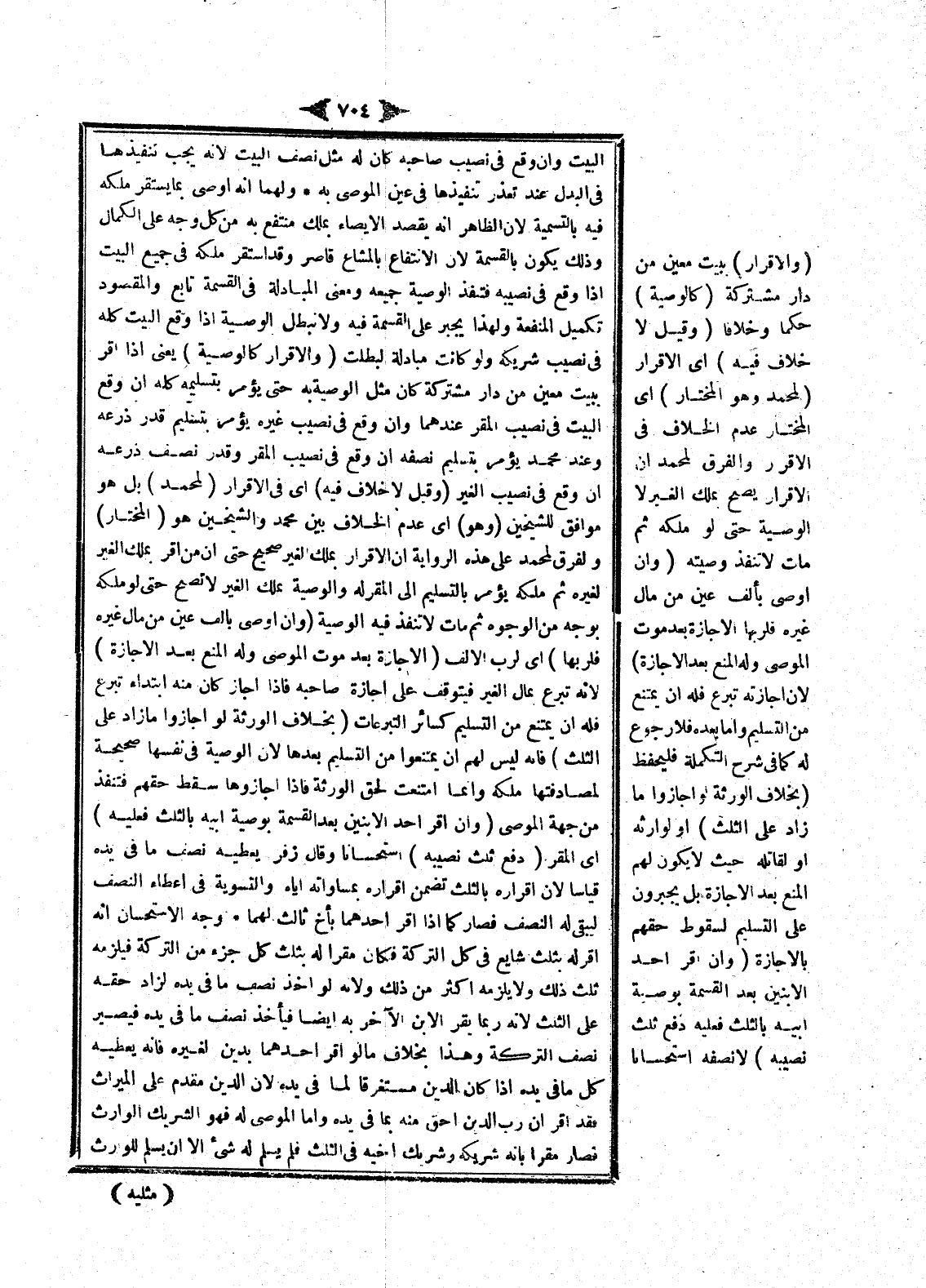 الْبَيْتِ، وَإِنْ وَقَعَ فِي نَصِيبِ صَاحِبِهِ كَانَ لَهُ مِثْلُ نِصْفِ الْبَيْتِ؛ لِأَنَّهُ يَجِبُ تَنْفِيذُهَا فِي الْبَدَلِ عِنْدَ تَعَذُّرِ تَنْفِيذِهَا فِي عَيْنِ الْمُوصَى بِهِ، وَلَهُمَا أَنَّهُ أَوْصَى بِمَا يَسْتَقِرُّ مِلْكُهُ فِيهِ بِالتَّسْمِيَةِ؛ لِأَنَّ الظَّاهِرَ أَنَّهُ يَقْصِدُ الْإِيصَاءَ بِمِلْكٍ مُنْتَفَعٍ بِهِ مِنْ كُلِّ وَجْهٍ عَلَى الْكَمَالِ وَذَلِكَ يَكُونُ بِالْقِسْمَةِ؛ لِأَنَّ الِانْتِفَاعَ بِالْمُشَاعِ قَاصِرٌ وَقَدْ اسْتَقَرَّ مِلْكُهُ فِي جَمِيعِ الْبَيْتِ إذَا وَقَعَ فِي نَصِيبِهِ فَتَنْفُذُ الْوَصِيَّةُ فِي جَمِيعِهِ، وَمَعْنَى الْمُبَادَلَةِ فِي الْقِسْمَةِ تَابِعٌ وَالْمَقْصُودُ تَكْمِيلُ الْمَنْفَعَةِ وَلِهَذَا يُجْبَرُ عَلَى الْقِسْمَةِ فِيهِ وَلَا تَبْطُلُ الْوَصِيَّةُ إذَا وَقَعَ الْبَيْتُ كُلُّهُ فِي نَصِيبِ شَرِيكِهِ، وَلَوْ كَانَتْ مُبَادَلَةً لَبَطَلَتْ (وَالْإِقْرَارُ كَالْوَصِيَّةِ) يَعْنِي إذَا أَقَرَّ بِبَيْتٍ مُعَيَّنٍ مِنْ دَارٍ مُشْتَرَكَةٍ كَانَ مِثْلَ الْوَصِيَّةِ بِهِ حَتَّى يُؤْمَرَ بِتَسْلِيمِهِ كُلِّهِ إنْ وَقَعَ الْبَيْتُ فِي نَصِيبِ الْمُقِرِّ عِنْدَهُمَا، وَإِنْ وَقَعَ فِي نَصِيبِ غَيْرِهِ يُؤْمَرُ بِتَسْلِيمِ قَدْرِ ذَرْعِهِ وَعِنْدَ مُحَمَّدٍ يُؤْمَرُ بِتَسْلِيمِ نِصْفِهِ إنْ وَقَعَ فِي نَصِيبِ الْمُقِرِّ وَقَدْرِ نِصْفِ ذَرْعِهِ إنْ وَقَعَ فِي نَصِيبِ الْغَيْرِ (وَقِيلَ لَا خِلَافَ فِيهِ) أَيْ فِي الْإِقْرَارِ (لِمُحَمَّدٍ) بَلْ هُوَ مُوَافِقٌ لِلشَّيْخَيْنِ (وَهُوَ) أَيْ عَدَمُ الْخِلَافِ بَيْنَ مُحَمَّدٍ وَالشَّيْخَيْنِ هُوَ (الْمُخْتَارُ) وَالْفَرْقُ لِمُحَمَّدٍ عَلَى هَذِهِ الرِّوَايَةِ أَنَّ الْإِقْرَارَ بِمِلْكِ الْغَيْرِ صَحِيحٌ حَتَّى أَنَّ مَنْ أَقَرَّ بِمِلْكِ الْغَيْرِ لِغَيْرِهِ ثُمَّ مَلَكَهُ يُؤْمَرُ بِالتَّسْلِيمِ إلَى الْمُقَرِّ لَهُ وَالْوَصِيَّةُ بِمِلْكِ الْغَيْرِ لَا تَصِحُّ حَتَّى لَوْ مَلَكَهُ بِوَجْهٍ مِنْ الْوُجُوهِ ثُمَّ مَاتَ لَا تَنْفُذُ فِيهِ الْوَصِيَّةُ.