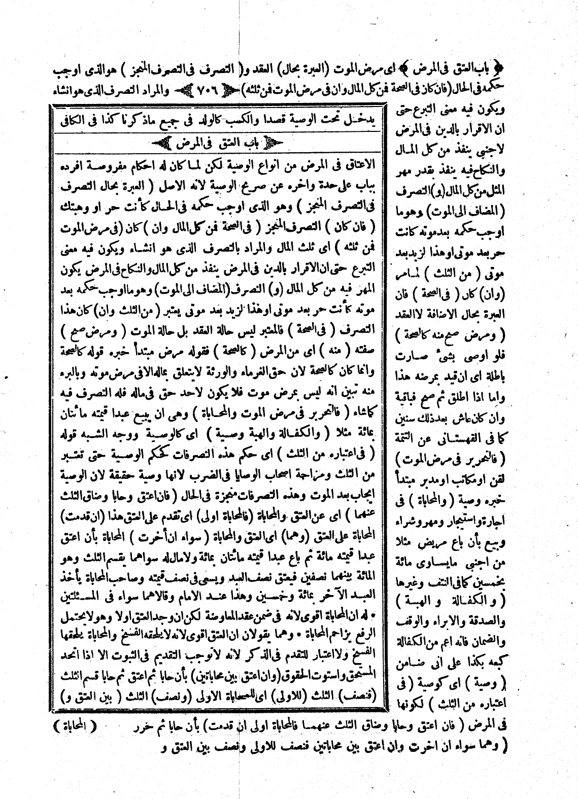 الْإِعْتَاقُ فِي الْمَرَضِ مِنْ أَنْوَاعِ الْوَصِيَّةِ لَكِنْ لَمَّا كَانَ لَهُ أَحْكَامٌ مَفْرُوضَةٌ أَفْرَدَهُ بِبَابٍ عَلَى حِدَةٍ وَأَخَّرَهُ عَنْ صَرِيحِ الْوَصِيَّةِ؛ لِأَنَّهُ الْأَصْلُ (الْعِبْرَةُ بِحَالِ التَّصَرُّفِ فِي التَّصَرُّفِ الْمُنَجَّزِ) وَهُوَ الَّذِي أَوْجَبَ حُكْمَهُ فِي الْحَالِ كَأَنْتَ حُرٌّ أَوْ وَهَبْتُك (فَإِنْ كَانَ) التَّصَرُّفُ الْمُنَجَّزُ (فِي الصِّحَّةِ فَمِنْ كُلِّ الْمَالِ، وَإِنْ) كَانَ (فِي مَرَضِ الْمَوْتِ فَمِنْ ثُلُثِهِ) أَيْ ثُلُثِ الْمَالِ وَالْمُرَادُ بِالتَّصَرُّفِ الَّذِي هُوَ إنْشَاءٌ وَيَكُونُ فِيهِ مَعْنَى التَّبَرُّعِ حَتَّى إنَّ الْإِقْرَارَ بِالدَّيْنِ فِي الْمَرَضِ يَنْفُذُ مِنْ كُلِّ الْمَالِ وَالنِّكَاحُ فِي الْمَرَضِ يَكُونُ الْمَهْرُ فِيهِ مِنْ كُلِّ الْمَالِ (وَ) التَّصَرُّفُ (الْمُضَافُ إلَى الْمَوْتِ) وَهُوَ مَا أَوْجَبَ حُكْمَهُ بَعْدَ مَوْتِهِ كَأَنْتَ حُرٌّ بَعْدَ مَوْتِي أَوْ هَذَا لِزَيْدٍ بَعْدَ مَوْتِي يُعْتَبَرُ (مِنْ الثُّلُثِ، وَإِنْ) كَانَ هَذَا التَّصَرُّفُ (فِي الصِّحَّةِ) فَالْمُعْتَبَرُ لَيْسَ حَالَةَ الْعَقْدِ بَلْ حَالَةَ الْمَوْتِ (وَمَرَضٌ صَحَّ) صِفَتُهُ (مِنْهُ) أَيْ مِنْ الْمَرَضِ (كَالصِّحَّةِ) فَقَوْلُهُ مَرَضٌ مُبْتَدَأٌ خَبَرُهُ قَوْلُهُ كَالصِّحَّةِ وَإِنَّمَا كَانَ كَالصِّحَّةِ؛ لِأَنَّ حَقَّ الْغُرَمَاءِ وَالْوَرَثَةِ لَا يَتَعَلَّقُ بِمَالِهِ إلَّا فِي مَرَضِ مَوْتِهِ وَبِالْبُرْءِ مِنْهُ تَبَيَّنَ أَنَّهُ لَيْسَ بِمَرَضِ مَوْتٍ فَلَا يَكُونُ لِأَحَدٍ حَقٌّ فِي مَالِهِ فَلَهُ التَّصَرُّفُ فِيهِ كَمَا شَاءَ (فَالتَّحْرِيرُ فِي مَرَضِ الْمَوْتِ وَالْمُحَابَاةُ) وَهِيَ أَنْ يَبِيعَ عَبْدًا قِيمَتُهُ مِائَتَانِ بِمِائَةٍ مَثَلًا (وَالْكَفَالَةُ وَالْهِبَةُ وَصِيَّةٌ) أَيْ كَالْوَصِيَّةِ وَوَجْهُ الشُّبْهَةِ قَوْلُهُ (فِي اعْتِبَارِهِ مِنْ الثُّلُثِ) أَيْ حُكْمُ هَذِهِ التَّصَرُّفَاتِ كَحُكْمِ الْوَصِيَّةِ حَتَّى تُعْتَبَرَ مِنْ الثُّلُثِ وَمُزَاحَمَةُ أَصْحَابِ الْوَصَايَا فِي الضَّرْبِ؛ لِأَنَّهَا وَصِيَّةٌ حَقِيقَةً؛ لِأَنَّ الْوَصِيَّةَ إيجَابٌ بَعْدَ الْمَوْتِ وَهَذِهِ التَّصَرُّفَاتُ مُنَجَّزَةٌ فِي الْحَالِ.