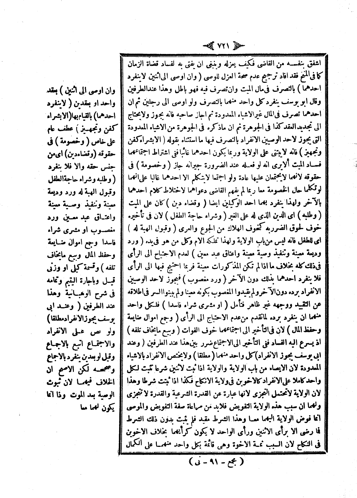 (أَوْ مُشْرَى شِرَاءً فَاسِدًا) فَلِكُلِّ وَاحِدٍ مِنْهُمَا أَنْ يَنْفَرِدَ بِرَدِّهِ لِمَا تَقَدَّمَ مِنْ عَدَمِ الِاحْتِيَاجِ إلَى الرَّأْيِ (وَجَمْعِ أَمْوَالٍ ضَائِعَةٍ وَحِفْظِ الْمَالِ) لِأَنَّ فِي التَّأْخِيرِ إلَى اجْتِمَاعِهِمَا خَوْفَ الْفَوَاتِ (وَبَيْعِ مَا يُخَافُ تَلَفُهُ) إذْ يُسْرِعُ إلَيْهِ الْفَسَادُ فَفِي التَّأْخِيرِ إلَى الِاجْتِمَاعِ ضَرَرٌ بَيِّنٌ هَذَا عِنْدَ الطَّرَفَيْنِ (وَعِنْدَ أَبِي يُوسُفَ يَجُوزُ الِانْفِرَادُ) كُلُّ وَاحِدٍ مِنْهُمَا (مُطْلَقًا) وَلَا يَخْتَصُّ الِانْفِرَادُ بِالْأَشْيَاءِ الْمَعْدُودَةِ؛ لِأَنَّ الْإِيصَاءَ مِنْ بَابِ الْوِلَايَةِ إذَا ثَبَتَ لِاثْنَيْنِ شَرْعًا تَثْبُتُ لِكُلِّ وَاحِدٍ كَامِلًا عَلَى الِانْفِرَادِ كَالْأَخَوَيْنِ فِي وِلَايَةِ الْإِنْكَاحِ فَكَذَا إذَا ثَبَتَتْ شَرْطًا، وَهَذَا لِأَنَّ الْوِلَايَةَ لَا تَحْتَمِلُ التَّجَزُّؤَ لِأَنَّهَا عِبَارَةٌ عَنْ الْقُدْرَةِ الشَّرْعِيَّةِ، وَالْقُدْرَةُ لَا تَتَجَزَّأُ وَلَهُمَا أَنَّ سَبَبَ هَذِهِ الْوِلَايَةِ التَّفْوِيضُ فَلَا بُدَّ مِنْ مُرَاعَاةِ صِفَةِ التَّفْوِيضِ وَالْمُوصِي إنَّمَا فَوَّضَ الْوِلَايَةَ إلَيْهِمَا مَعًا وَهَذَا الشَّرْطُ مُقَيَّدٌ فَلَمْ يَثْبُتْ بِدُونِ ذَلِكَ الشَّرْطِ فَمَا رَضِيَ إلَّا بِرَأْيِ الِاثْنَيْنِ، وَرَأْيُ الْوَاحِدِ لَا يَكُونُ كَرَأْيِهِمَا بِخِلَافِ الْأَخَوَيْنِ فِي النِّكَاحِ؛ لِأَنَّ السَّبَبَ ثَمَّةَ الْأُخُوَّةُ وَهِيَ قَائِمَةٌ بِكُلِّ وَاحِدٍ مِنْهُمَا عَلَى الْكَمَالِ