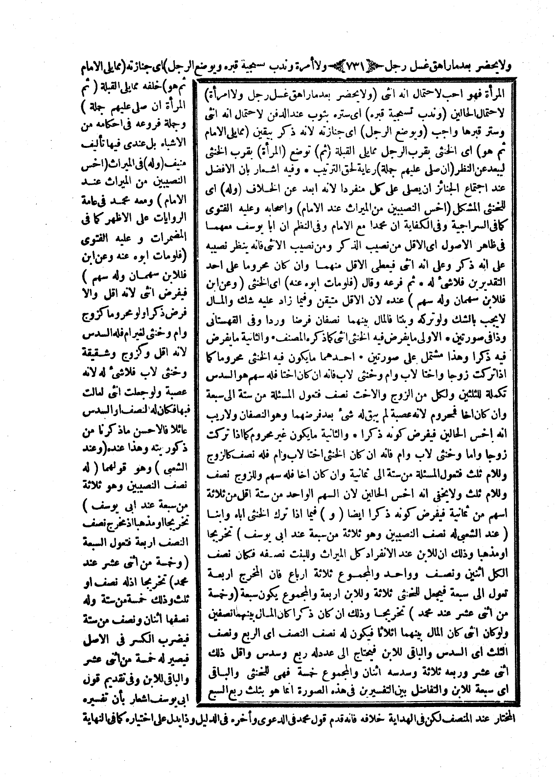 (وَ) فِيمَا إذَا تَرَكَ الْخُنْثَى أَبَاهُ وَابْنًا (عِنْدَ الشَّعْبِيِّ لَهُ نِصْفُ النَّصِيبَيْنِ وَهُوَ ثَلَاثَةٌ مِنْ سَبْعَةٍ عِنْدَ أَبِي يُوسُفَ) تَخْرِيجًا أَوْ مَذْهَبًا، وَذَلِكَ أَنَّ لِلِابْنِ عِنْدَ الِانْفِرَادِ كُلَّ الْمِيرَاثِ وَلِلْبِنْتِ نِصْفَهُ، فَكَانَ نِصْفُ الْكُلِّ اثْنَيْنِ وَنِصْفٌ وَوَاحِدٌ وَالْمَجْمُوعُ ثَلَاثَةُ أَرْبَاعٍ فَإِنْ خَرَجَ أَرْبَعَةٌ تَعُولُ إلَى سَبْعَةٍ فَيُجْعَلُ لِلْخُنْثَى ثَلَاثَةٌ وَلِلِابْنِ أَرْبَعَةٌ وَالْمَجْمُوعُ يَكُونُ سَبْعَةً (وَخَمْسَةٌ مِنْ اثْنَيْ عَشَرَ عِنْدَ مُحَمَّدٍ) تَخْرِيجًا، وَذَلِكَ إنْ كَانَ ذَكَرًا كَانَ الْمَالُ بَيْنَهُمَا نِصْفَيْنِ، وَلَوْ كَانَ أُنْثَى كَانَ الْمَالُ بَيْنَهُمَا أَثْلَاثًا فَيَكُونُ لَهُ نِصْفُ النِّصْفِ أَيْ الرُّبْعَ، وَنِصْفُ الثُّلُثِ أَيْ السُّدُسَ وَالْبَاقِي لِلِابْنِ فَيُحْتَاجُ إلَى عَدَدٍ لَهُ رُبْعٌ وَسُدُسٌ، وَأَقَلُّ ذَلِكَ اثْنَيْ عَشَرَ وَرُبْعُهُ ثَلَاثَةٌ وَسُدُسُهُ اثْنَانِ وَالْمَجْمُوعُ خَمْسَةٌ فَهِيَ لِلْخُنْثَى وَالْبَاقِي أَيْ سَبْعَةٌ لِلِابْنِ وَالتَّفَاضُلُ بَيْنَ التَّفْسِيرَيْنِ فِي هَذِهِ الصُّورَةِ إنَّمَا هُوَ بِثُلُثِ رُبْعِ السُّبُعِ