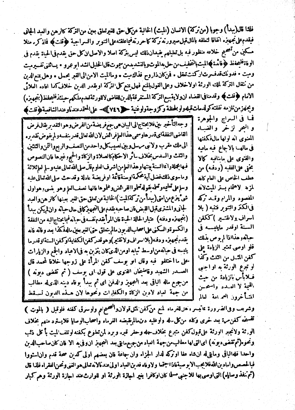 (يُبْدَأُ مِنْ تَرِكَةِ الْمَيِّتِ) الْخَالِيَةِ عَنْ تَعَلُّقِ حَقِّ الْغَيْرِ بِعَيْنِهَا كَالرَّهْنِ وَالْعَبْدِ الْجَانِي وَالْمُشْتَرِي قَبْلَ الْقَبْضِ فَإِنَّ صَاحِبَهُ يُقَدَّمُ عَلَى التَّجْهِيزِ كَمَا فِي حَالِ حَيَاتِهِ، وَإِنْ لَمْ يَكُنْ يُبْدَأُ (بِتَجْهِيزِهِ وَدَفْنِهِ) اعْتِبَارًا لِحَالَةِ الْحَيَاةِ فَإِنَّ الْمَرْءَ يُقَدِّمُ نَفْسَهُ فِي حَيَاتِهِ فِيمَا يَحْتَاجُ إلَيْهِ مِنْ النَّفَقَةِ وَالْكِسْوَةِ وَالسُّكْنَى عَلَى أَصْحَابِ الدُّيُونِ مَا لَمْ يَتَعَلَّقْ حَقُّ الْغَيْرِ بِعَيْنِ مَالِهِ فَكَذَا بَعْدَ وَفَاتِهِ، فَإِنَّهُ يُقَدَّمُ تَجْهِيزُهُ وَدَفْنُهُ (بِلَا إسْرَافٍ وَلَا تَقْتِيرٍ) وَهُوَ قَدْرُ كَفَنِ الْكِفَايَةِ أَوْ كَفَنِ السُّنَّةِ، أَوْ قَدْرَ مَا يَلْبَسُهُ فِي حَيَاتِهِ مِنْ أَوْسَطِ ثِيَابِهِ أَوْ مِنْ الَّذِي يَتَزَيَّنُ بِهِ فِي الْأَعْيَادِ وَالْجُمَعِ وَالزِّيَارَاتِ عَلَى مَا اخْتَلَفُوا فِيهِ.