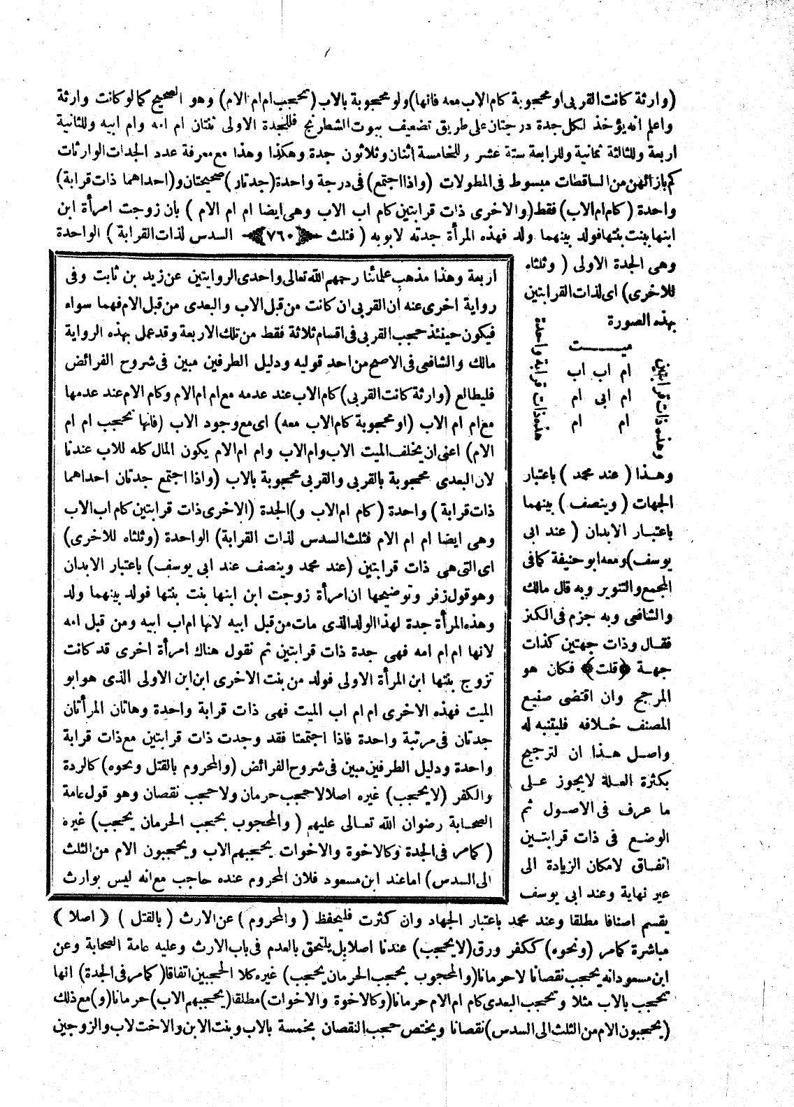 وَفِي رِوَايَةٍ أُخْرَى عَنْهُ أَنَّ الْقُرْبَى إنْ كَانَتْ مِنْ قِبَلِ الْأَبِ وَالْبُعْدَى مِنْ قِبَلِ الْأُمِّ فَهُمَا سَوَاءٌ فَيَكُونُ حِينَئِذٍ حَجْبُ الْقُرْبَى فِي أَقْسَامٍ ثَلَاثَةٍ فَقَطْ مِنْ تِلْكَ الْأَرْبَعَةِ وَقَدْ عَمِلَ بِهَذِهِ الرِّوَايَةِ مَالِكٌ وَالشَّافِعِيُّ فِي الْأَصَحِّ مِنْ أَحَدِ قَوْلَيْهِ وَدَلِيلُ الطَّرَفَيْنِ مُبَيَّنٌ فِي شُرُوحِ الْفَرَائِضِ فَلْيُطَالَعْ (وَارِثَةً كَانَتْ الْقُرْبَى) كَأُمِّ الْأَبِ عِنْدَ عَدَمِهِ مَعَ أُمِّ أُمِّ الْأُمِّ وَكَأُمِّ الْأُمِّ عِنْدَ عَدَمِهَا مَعَ أُمِّ أُمِّ الْأَبِ (أَوْ مَحْجُوبَةً كَأُمِّ الْأَبِ مَعَهُ) أَيْ مَعَ وُجُودِ الْأَبِ (فَإِنَّهَا تَحْجُبُ أُمَّ أُمِّ الْأُمِّ) أَعْنِي أَنْ يَخْلُفَ الْمَيِّتُ الْأَبَ وَأَمَّ الْأَبِ وَأُمَّ أُمِّ الْأُمِّ يَكُونُ الْمَالُ كُلُّهُ لِلْأَبِ عِنْدَنَا؛ لِأَنَّ الْبُعْدَى مَحْجُوبَةٌ بِالْقُرْبَى وَالْقُرْبَى مَحْجُوبَةٌ بِالْأَبِ.
