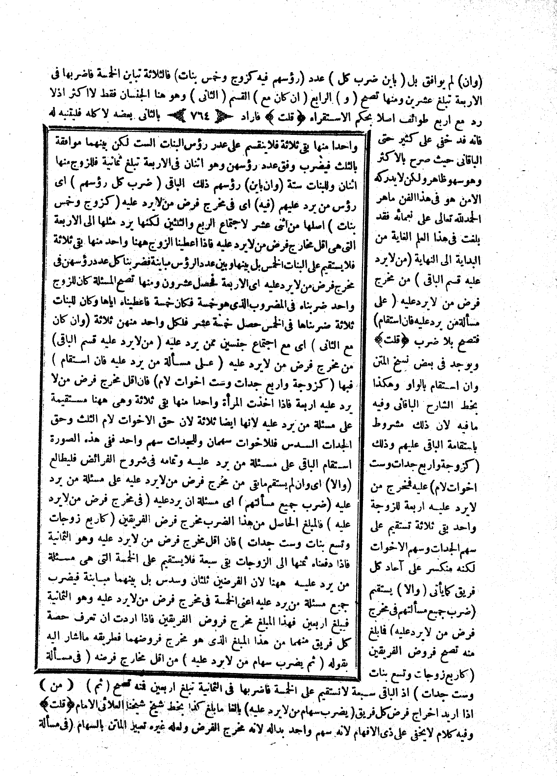 (وَإِنْ كَانَ مَعَ الثَّانِي) أَيْ مَعَ اجْتِمَاعِ جِنْسَيْنِ مِمَّنْ يُرَدُّ عَلَيْهِ (مَنْ لَا يُرَدُّ عَلَيْهِ قُسِمَ الْبَاقِي) مِنْ مَخْرَجِ فَرْضِ مَنْ لَا يُرَدُّ عَلَيْهِ (عَلَى مَسْأَلَةِ مَنْ يُرَدُّ عَلَيْهِ فَإِنْ اسْتَقَامَ) فَبِهَا (كَزَوْجَةٍ وَأَرْبَعِ جَدَّاتٍ وَسِتِّ أَخَوَاتٍ لِأُمٍّ) فَإِنَّ أَقَلَّ مَخْرَجِ فَرْضِ مَنْ لَا يُرَدُّ عَلَيْهِ أَرْبَعَةٌ، فَإِذَا أَخَذَتْ الْمَرْأَةُ وَاحِدًا مِنْهَا بَقِيَ ثَلَاثَةٌ وَهِيَ هَهُنَا مُسْتَقِيمَةٌ عَلَى مَسْأَلَةِ مَنْ يُرَدُّ عَلَيْهِ؛ لِأَنَّهَا أَيْضًا ثَلَاثَةٌ؛ لِأَنَّ حَقَّ الْأَخَوَاتِ لِأُمٍّ الثُّلُثُ وَحَقُّ الْجَدَّاتِ السُّدُسُ فَلِلْأَخَوَاتِ سَهْمَانِ وَلِلْجَدَّاتِ سَهْمٌ وَاحِدٌ فَفِي هَذِهِ الصُّورَةِ اسْتَقَامَ الْبَاقِي عَلَى مَسْأَلَةِ مَنْ يُرَدُّ عَلَيْهِ وَتَمَامُهُ فِي شُرُوحِ الْفَرَائِضِ فَلْيُطَالَعْ (وَإِلَّا) أَيْ وَإِنْ لَمْ يَسْتَقِمْ مَا بَقِيَ مِنْ مَخْرَجِ فَرْضِ مَنْ لَا يُرَدُّ عَلَيْهِ عَلَى مَسْأَلَةِ مَنْ يُرَدُّ عَلَيْهِ (ضَرَبَ جَمِيعَ مَسْأَلَتِهِمْ) أَيْ مَسْأَلَةَ مَنْ يُرَدُّ عَلَيْهِ (فِي مَخْرَجِ فَرْضِ مَنْ لَا يُرَدُّ عَلَيْهِ) فَالْمَبْلَغُ الْحَاصِلُ مِنْ هَذَا الضَّرْبِ مَخْرَجُ فَرْضِ الْفَرِيقَيْنِ (كَأَرْبَعِ زَوْجَاتٍ وَتِسْعِ بَنَاتٍ وَسِتِّ جَدَّاتٍ) فَإِنَّ أَقَلَّ مَخْرَجِ فَرْضِ مَنْ لَا يُرَدُّ عَلَيْهِ وَهُوَ الثَّمَانِيَةُ فَإِذَا دَفَعْنَاهُ ثُمُنَهَا إلَى الزَّوْجَاتِ بَقِيَ سَبْعَةٌ فَلَا يَسْتَقِيمُ عَلَى الْخَمْسَةِ الَّتِي هِيَ مَسْأَلَةُ مَنْ يُرَدُّ عَلَيْهِ هَهُنَا؛ لِأَنَّ الْفَرْضَيْنِ ثُلُثَانِ وَسُدُسٌ بَلْ بَيْنَهُمَا مُبَايَنَةٌ فَيَضْرِبُ جَمِيعَ مَسْأَلَةِ مَنْ يُرَدُّ عَلَيْهِ أَعْنِي الْخَمْسَةَ فِي مَخْرَجِ فَرْضِ مَنْ لَا يُرَدُّ عَلَيْهِ وَهُوَ الثَّمَانِيَةُ فَيَبْلُغُ أَرْبَعِينَ فَهَذَا الْمَبْلَغُ مَخْرَجُ فُرُوضِ الْفَرِيقَيْنِ، فَإِذَا أَرَدْت أَنْ تَعْرِفَ حِصَّةَ كُلِّ فَرِيقٍ مِنْهُمَا مِنْ هَذَا الْمَبْلَغِ الَّذِي هُوَ مَخْرَجُ فُرُوضِهِمَا فَطَرِيقُهُ مَا أَشَارَ إلَيْهِ بِقَوْلِهِ (ثُمَّ يَضْرِبُ سِهَامَ مَنْ لَا يُرَدُّ عَلَيْهِ) مِنْ أَقَلِّ مَخَارِجِ فَرْضِهِ (فِي مَسْأَلَةِ