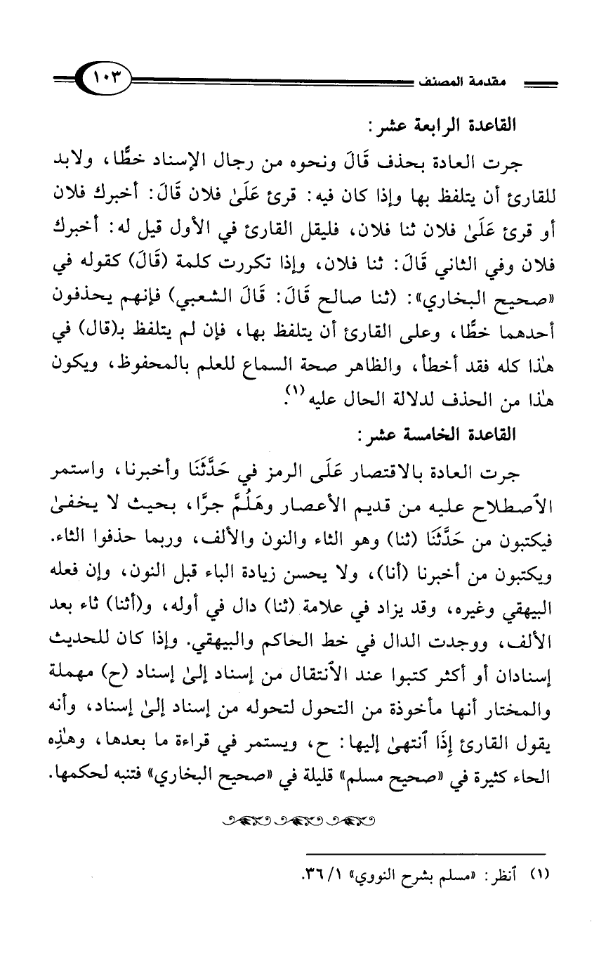 جرت العادة بحذف قَالَ ونحوه من رجال الإسناد خطًّا، ولابد للقارئ أن يتلفظ بها وإذا كان فيه: قرئ عَلَى فلان قَالَ: أخبرك فلان أو قرئ عَلَى فلان ثنا فلان، فليقل القارئ في الأول قيل له: أخبرك فلان وفي الثاني قَالَ: ثنا فلان، وإذا تكررت كلمة (قَالَ) كقوله في "صحيح البخاري": (ثنا صالح قَالَ: قَالَ الشعبي) فإنهم يحذفون أحدهما خطًّّا، وعلى القارئ أن يتلفظ بها، فإن لم يتلفظ بـ (قال) في هذا كله فقد أخطأ، والظاهر صحة السماع للعلم بالمحفوظ، ويكون هذا من الحذف لدلالة الحال عليه (¬1).