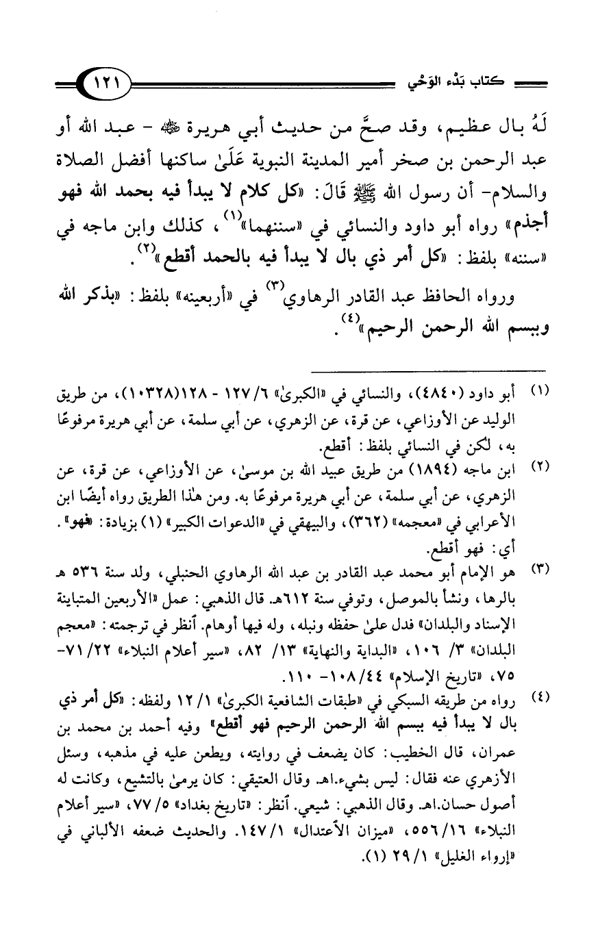 لَهُ بال عظيم، وقد صحَّ من حديث أبي هريرة لكنه - رضي الله عنه - عبد الله أو عبد الرحمن بن صخر أمير المدينة النبوية على ساكنها أفضل الصلاة والسلام- أن رسول الله - صلى الله عليه وسلم - قَالَ: "كل كلام لا يبدأ فيه بحمد الله فهو أجذم" رواه أبو داود والنسائي في "سننهما" (¬1)، كذلك وابن ماجه في "سننه" بلفظ: "كل أمر ذي بال لا يبدأ فيه بالحمد أقطع" (¬2).