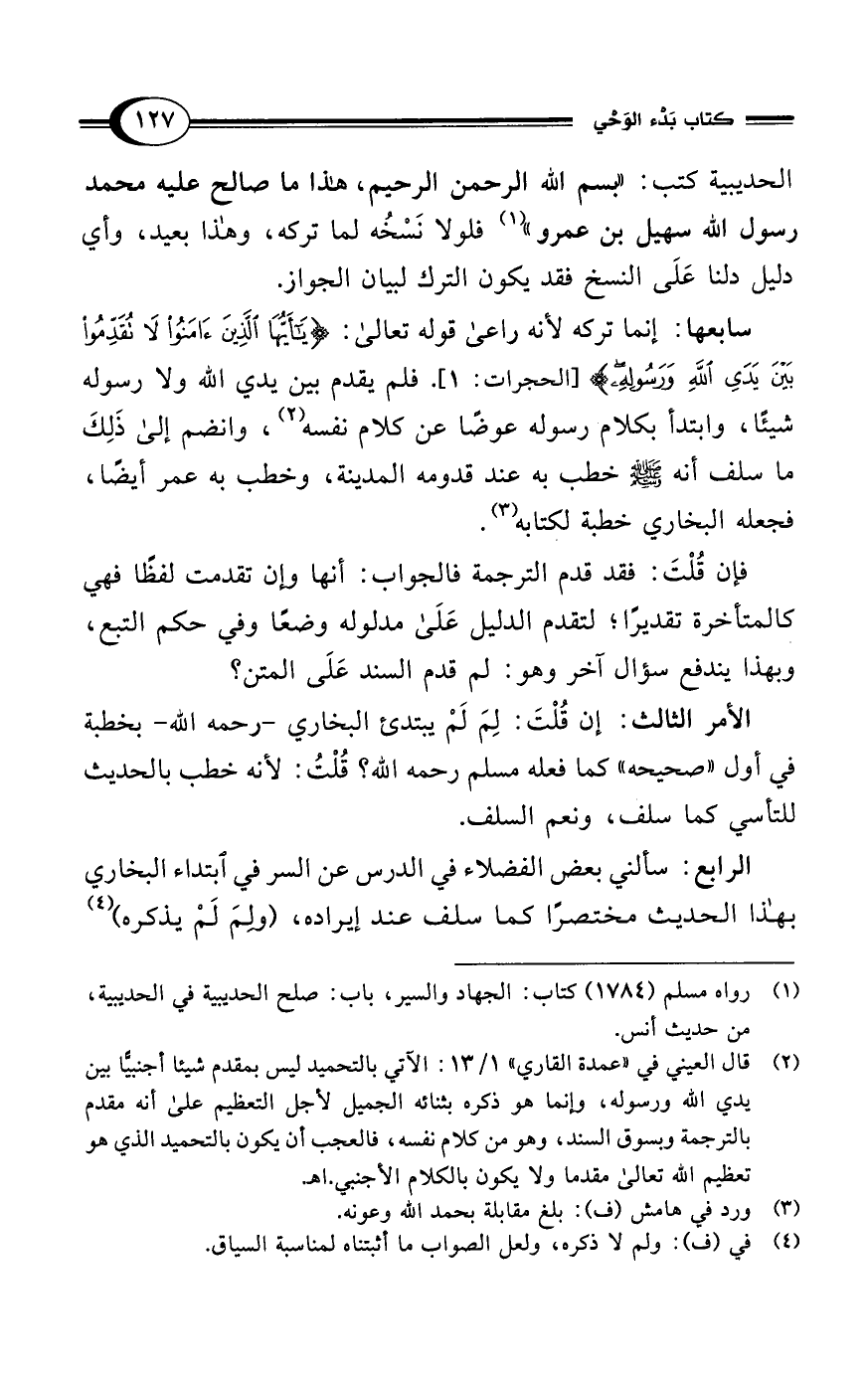 (¬2) قال العيني في "عمدة القاري" 1/ 13: الآتي بالتحميد ليس بمقدم شيئا أجنبيًّا بين يدي الله ورسوله، وإنما هو ذكره بثنائه الجميل لأجل التعظيم على أنه مقدم بالترجمة وبسوق السند، وهو من كلام نفسه، فالعجب أن يكون بالتحميد الذي هو تعظيم الله تعالى مقدما ولا يكون بالكلام الأجنبي. اهـ.