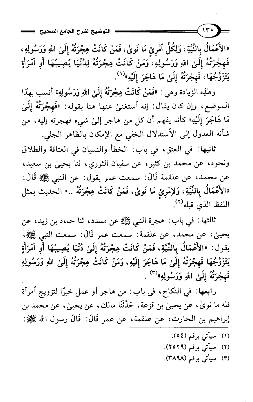 وهذِه الزيادة وهي: "فَمَنْ كَانَتْ هِجْرَتُهُ إلى اللهِ وَرَسُولِهِ" أنسب بهذا الموضع، وإن كان يقال: إنه استغنى عنها هنا بقوله: "فَهِجْرَتُهُ إلى مَا هَاجَرَ إِلَيْهِ" كأنه يفهم أن كل من هاجر إلى شيء فهجرته إليه، من شأنه العدول إلى الاستدلال الخفي مع الإمكان بالظاهر الجلي.