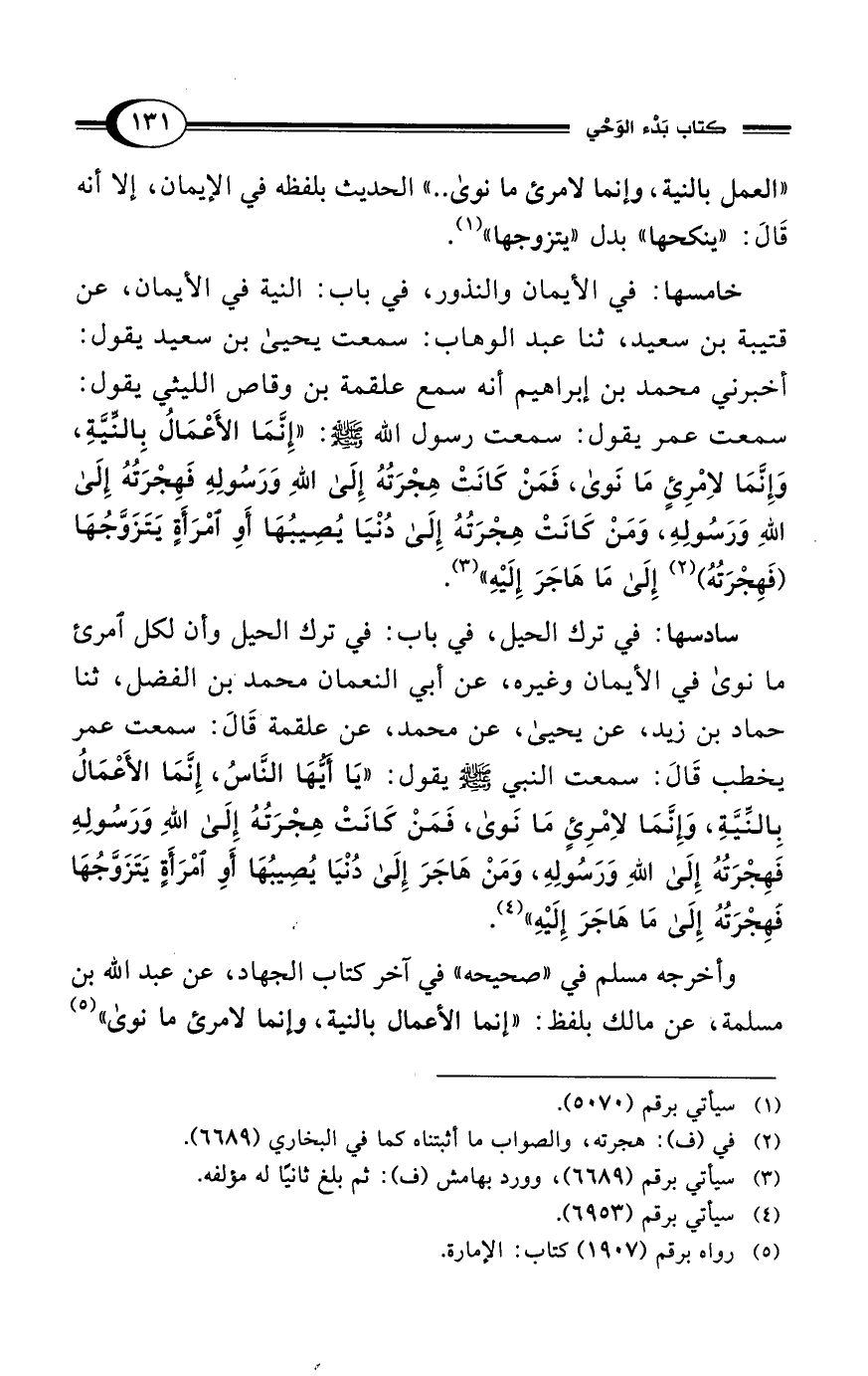 خامسها: في الأيمان والنذور، في باب: النية في الأيمان، عن قتيبة بن سعيد، ثنا عبد الوهاب: سمعت يحيى بن سعيد يقول: أخبرني محمد بن إبراهيم أنه سمع علقمة بن وقاص الليثي يقول: سمعت عمر يقول: سمعت رسول الله - صلى الله عليه وسلم -: "إِنَّمَا الأَعْمَالُ بِالنِّيَّةِ، وَإِنَّمَا لاِمْرِئٍ مَا نَوى، فَمَنْ كَانَتْ هِجْرَتُهُ إلى اللهِ وَرَسُولِهِ فَهِجْرَتُهُ إلى اللهِ وَرَسُولِهِ، وَمَنْ كَانَتْ هِجْرَتُهُ إلى دُنْيَا يُصِيبُهَا أَوِ أمْرَأَةٍ يَتَزَوَّجُهَا (فَهِجْرَتُهُ) (¬2) إلى مَا هَاجَرَ إِلَيْهِ" (¬3).