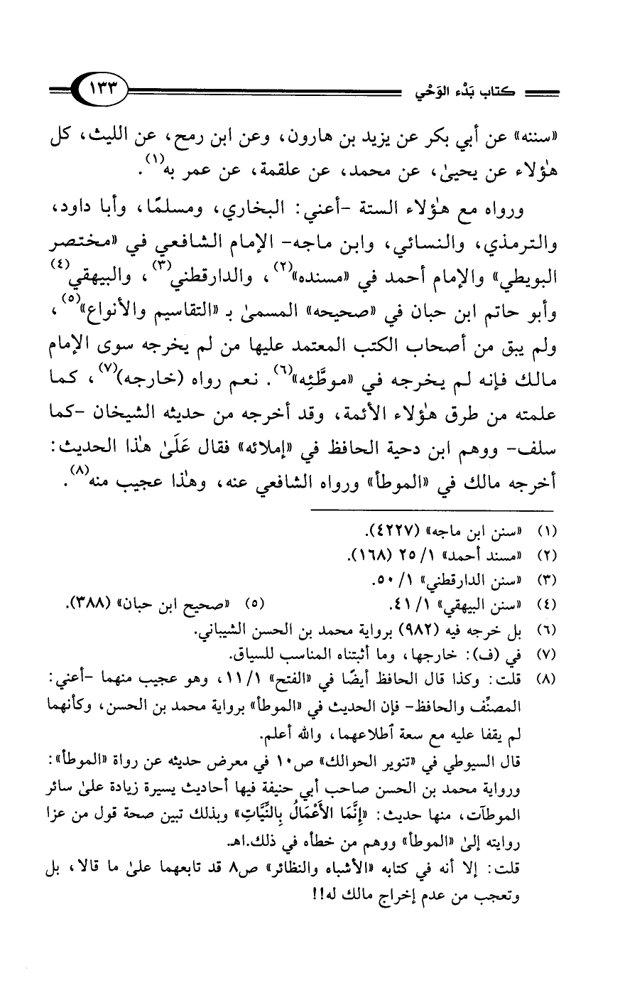 (¬8) قلت: وكذا قال الحافظ أيضًا في "الفتح" 1/ 11، وهو عجيب منهما -أعني: المصنف والحافظ- فإن الحديث في "الموطأ" برواية محمد بن الحسن، وكأنهما لم يقفا عليه مع سعة اطلاعهما، والله أعلم.