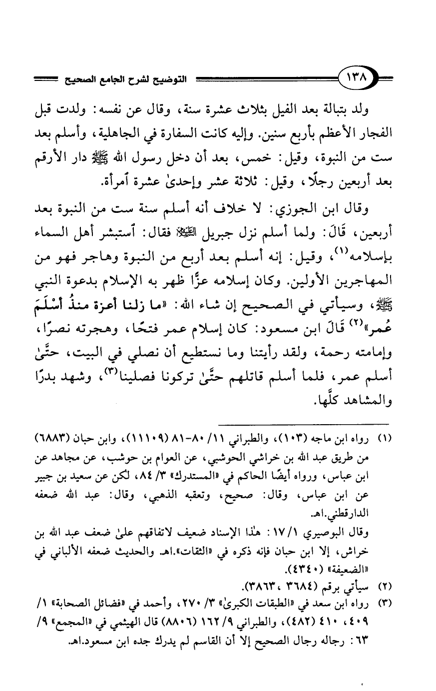 وقال ابن الجوزي: لا خلاف أنه أسلم سنة ست من النبوة بعد أربعين، قَالَ: ولما أسلم نزل جبريل -عليه السلام- فقال: استبشر أهل السماء بإسلامه (¬1)، وقيل: إنه أسلم بعد أربع من النبوة وهاجر فهو من المهاجرين الأولين. وكان إسلامه عزًّا ظهر به الإسلام بدعوة النبي - صلى الله عليه وسلم -، وسيأتي في الصحيح إن شاء الله: "ما زلنا أعزة منذُ أسْلَمَ عُمر" (¬2) قَالَ ابن مسعود: كان إسلام عمر فتحًا، وهجرته نصرًا، وإمامته رحمة، ولقد رأيتنا وما نستطيع أن نصلي في البيت، حتَّى أسلم عمر، فلما أسلم قاتلهم حتَّى تركونا فصلينا (¬3)، وشهد بدرًا والمشاهد كلَّها.