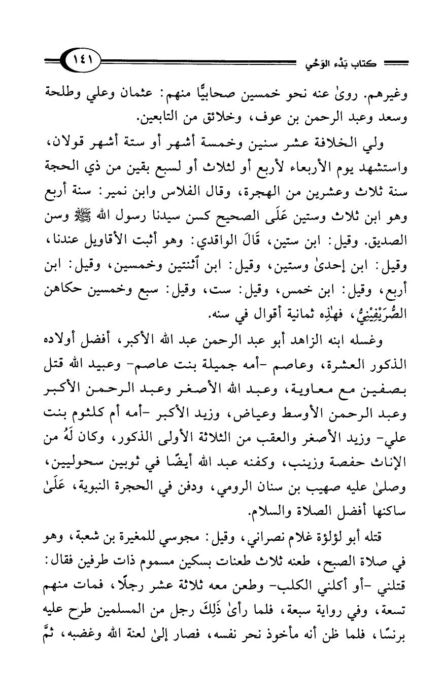 ولي الخلافة عشر سنين وخمسة أشهر أو ستة أشهر قولان، واستشهد يوم الأربعاء لأربع أو لثلاث أو لسبع بقين من ذي الحجة سنة ثلاث وعشرين من الهجرة، وقال الفلاس وابن نمير: سنة أربع وهو ابن ثلاث وستين عَلَى الصحيح كسن سيدنا رسول الله - صلى الله عليه وسلم - وسن الصديق. وقيل: ابن ستين، قَالَ الواقدي: وهو أثبت الأقاويل عندنا، وقيل: ابن إحدى وستين، وقيل: ابن اثنتين وخمسين، وقيل: ابن أربع، وقيل: ابن خمس، وقيل: ست، وقيل: سبع وخمسين حكاهن الصُّرَيْفِيْنِيُّ، فهذِه ثمانية أقوال في سنه.
