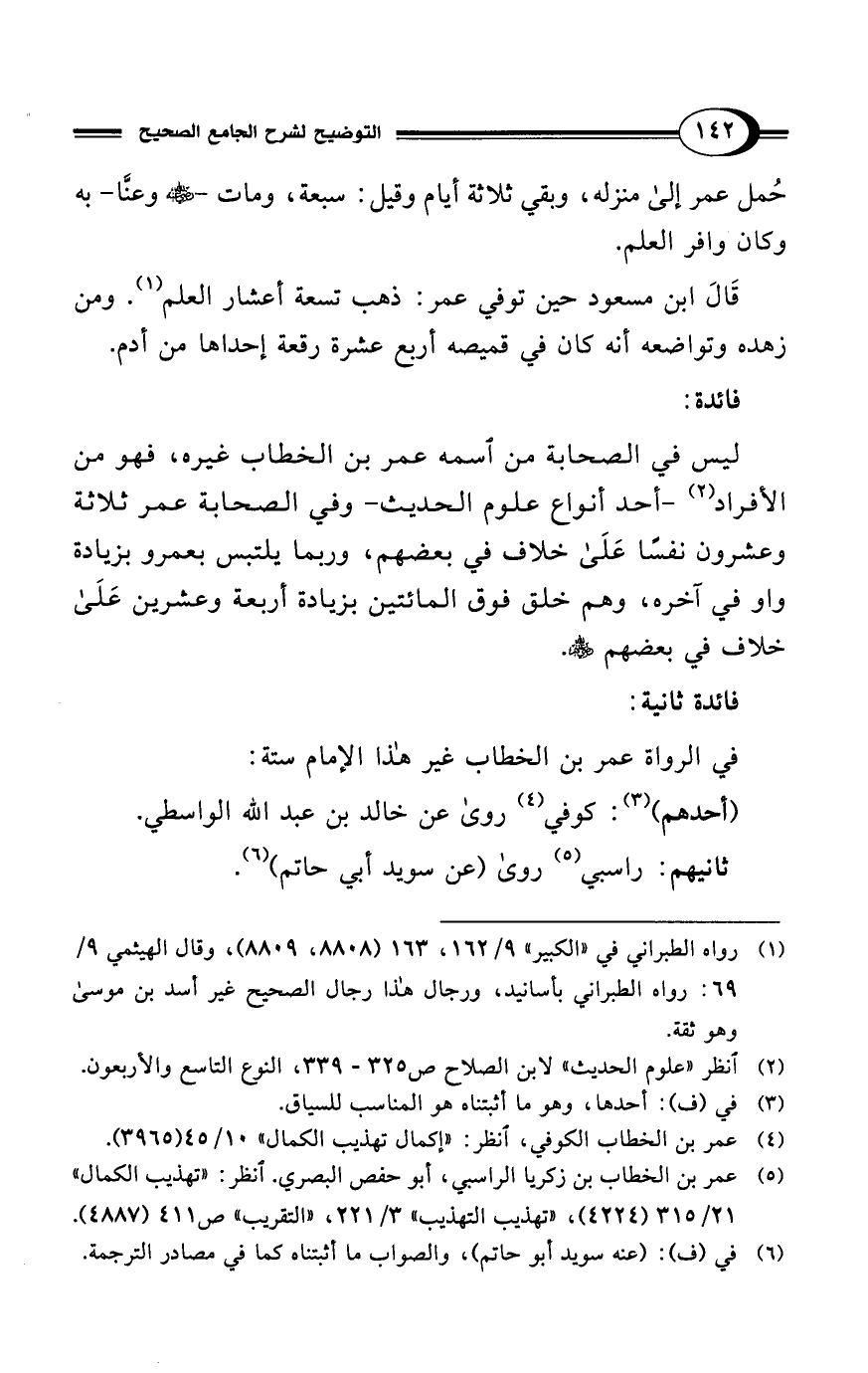 ليس في الصحابة من آسمه عمر بن الخطاب غيره، فهو من الأفراد (¬2) -أحد أنواع علوم الحديث- وفي الصحابة عمر ثلاثة وعشرون نفسًا على خلاف في بعضهم، وربما يلتبس بعمرو بزيادة واو في آخره، وهم خلق فوق المائتين بزيادة أربعة وعشرين على خلاف في بعضهم - رضي الله عنهم -.
