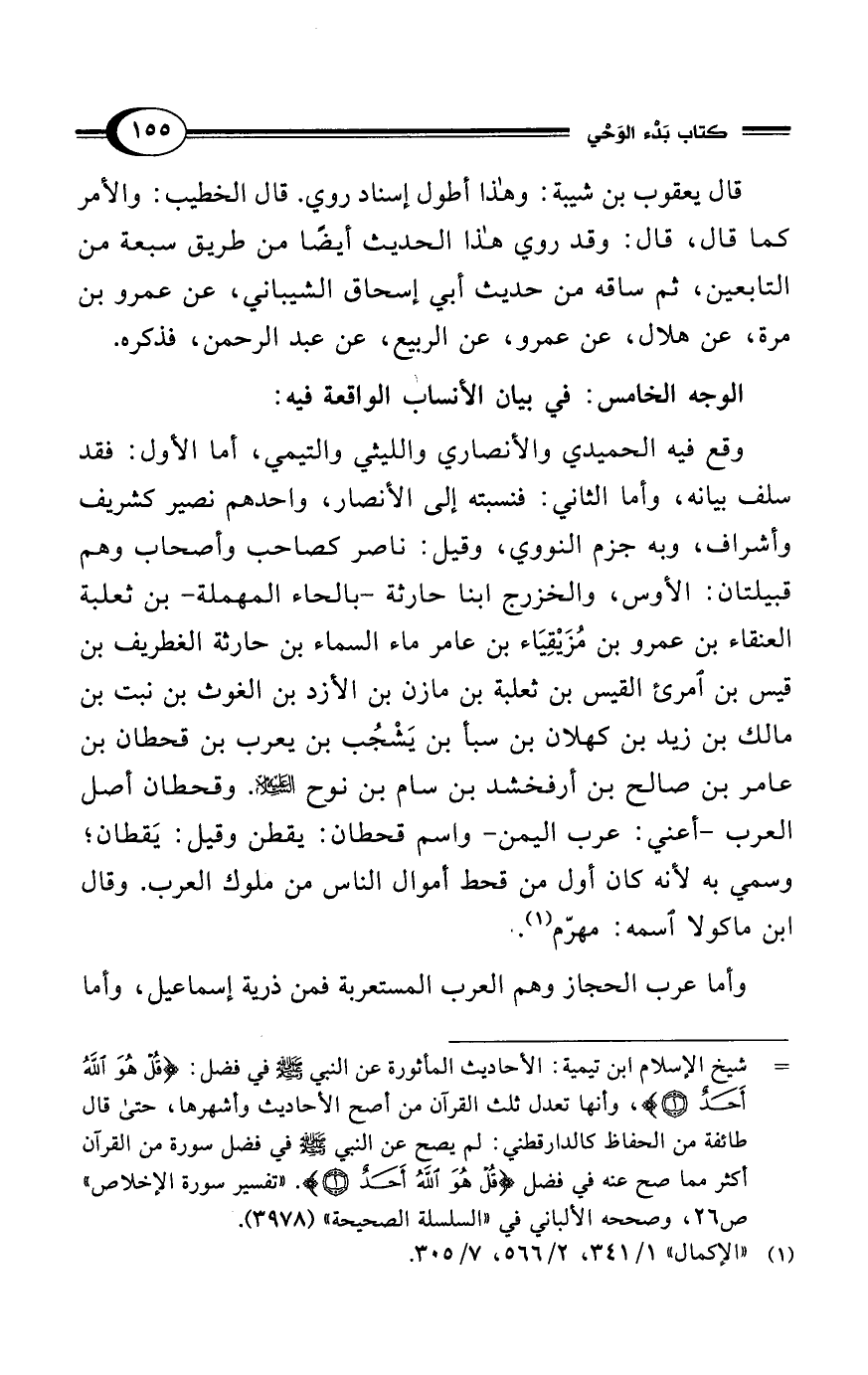 وقع فيه الحميدي والأنصاري والليثي والتيمي، أما الأول: فقد سلف بيانه، وأما الثاني: فنسبته إلى الأنصار، واحدهم نصير كشريف وأشراف، وبه جزم النووي، وقيل: ناصر كصاحب وأصحاب وهم قبيلتان: الأوس، والخزرج ابنا حارثة -بالحاء المهملة- بن ثعلبة العنقاء بن عمرو بن مُزَيْقِيَاء بن عامر ماء السماء بن حارثة الغطريف بن قيس بن امرئ القيس بن ثعلبة بن مازن بن الأزد بن الغوث بن نبت بن مالك بن زيد بن كهلان بن سبأ بن يَشْجُب بن يعرب بن قحطان بن عامر بن صالح بن أرفخشد بن سام بن نوح -عليه السلام-. وقحطان أصل العرب -أعني: عرب اليمن- واسم قحطان: يقطن وقيل: يَقطان؛ وسمي به لأنه كان أول من قحط أموال الناس من ملوك العرب. وقال ابن ماكولا اسمه: مهرّم (¬1).