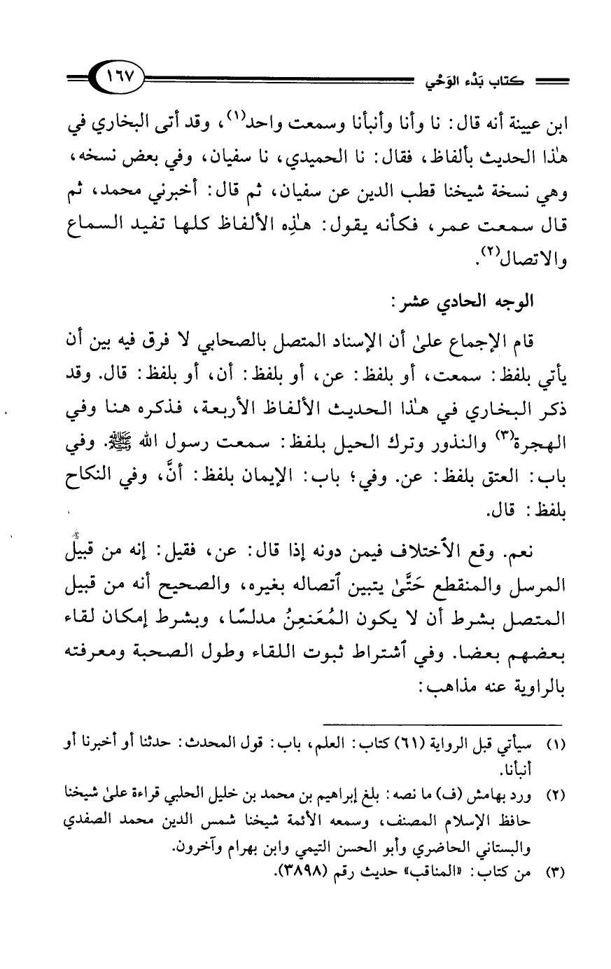 ابن عيينة أنه قال: نا وأنا وأنبأنا وسمعت واحد (¬1)، وقد أتى البخاري في هذا الحديث بألفاظ، فقال: نا الحميدي، نا سفيان، وفي بعض نسخه، وهي نسخة شيخنا قطب الدين عن سفيان، ثم قال: أخبرني محمد، ثم قال سمعت عمر، فكأنه يقول: هذِه الألفاظ كلها تفيد السماع والاتصال (¬2).