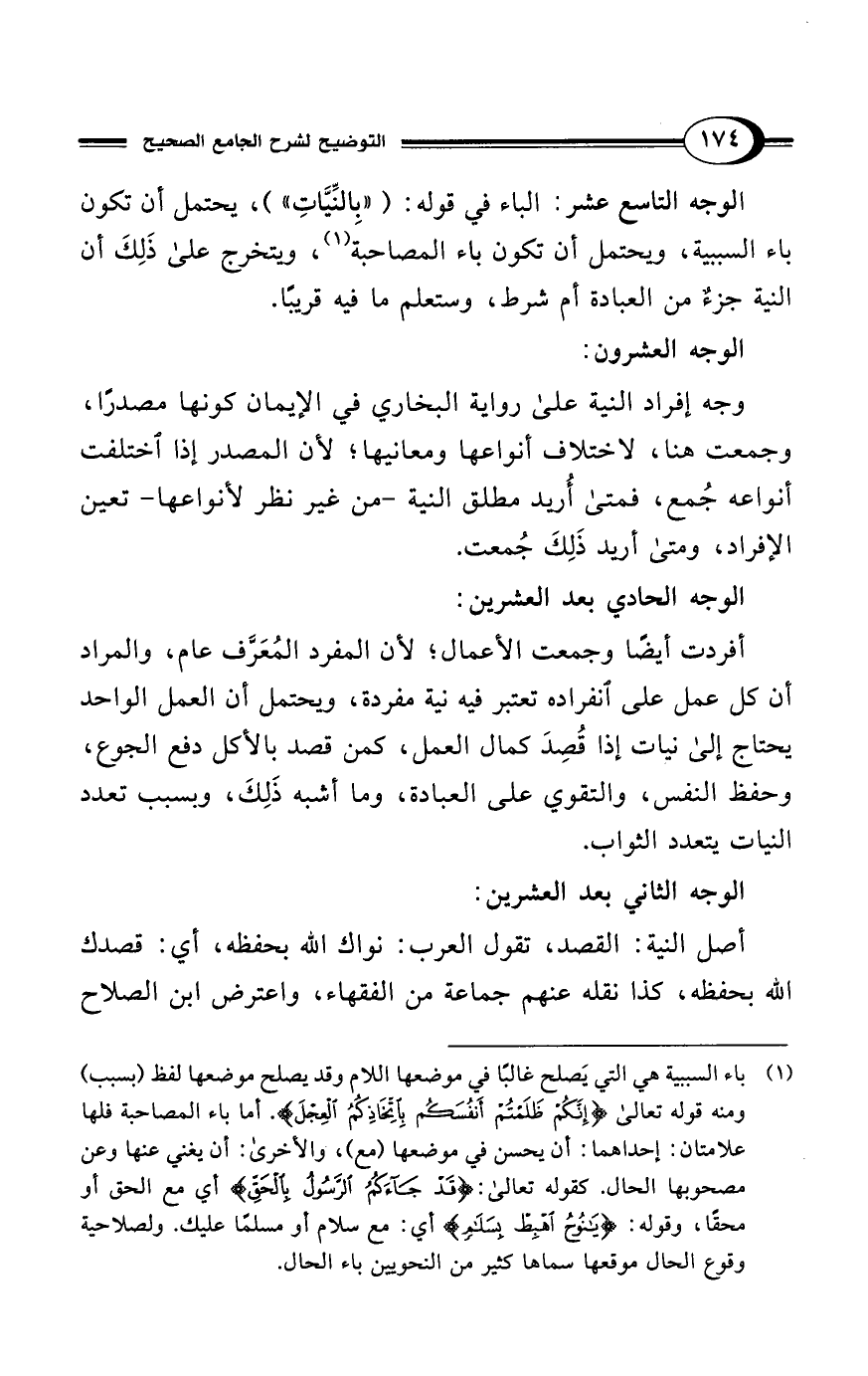 الوجه التاسع عشر: الباء في قوله: ("بِالنِّيَّاتِ")، يحتمل أن تكون باء السببية، ويحتمل أن تكون باء المصاحبة (¬1)، ويتخرج على ذَلِكَ أن النية جزءٌ من العبادة أم شرط، وستعلم ما فيه قريبًا.