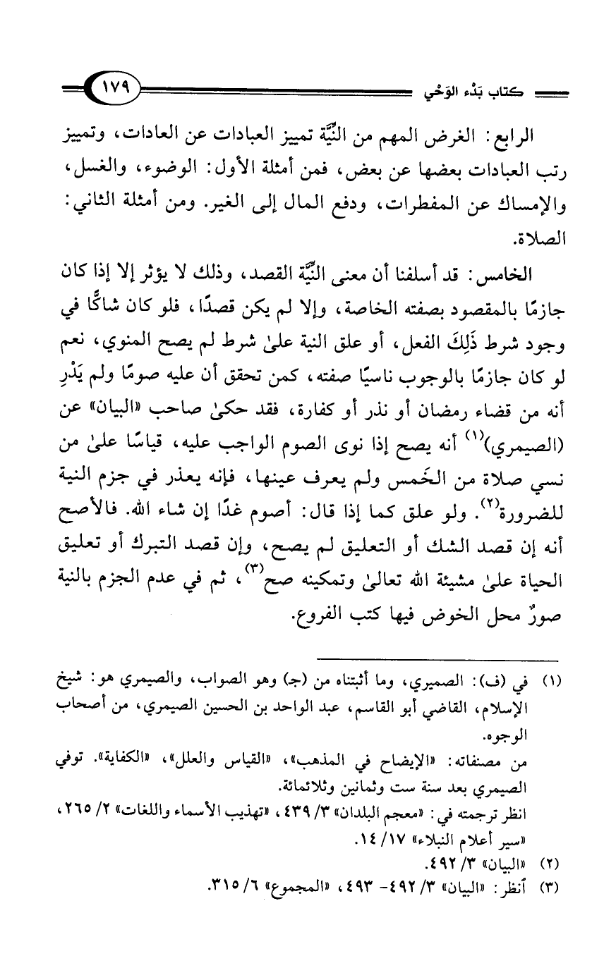 الخامس: قد أسلفنا أن معنى النِّيَّة القصد، وذلك لا يؤثر إلا إذا كان جازمًا بالمقصود بصفته الخاصة، وإلا لم يكن قصدًا، فلو كان شاكًّا في وجود شرط ذَلِكَ الفعل، أو علق النية على شرط لم يصح المنوي، نعم لو كان جازمًا بالوجوب ناسيًا صفته، كمن تحقق أن عليه صومًا ولم يَدْرِ أنه من قضاء رمضان أو نذر أو كفارة، فقد حكى صاحب "البيان" عن (الصيمري) (¬1) أنه يصح إذا نوى الصوم الواجب عليه، قياسًا على من نسي صلاة من الخَمس ولم يعرف عينها، فإنه يعذر في جزم النية للضرورة (¬2). ولو علق كما إذا قال: أصوم غدًا إن شاء الله. فالأصح أنه إن قصد الشك أو التعليق لم يصح، وإن قصد التبرك أو تعليق الحياة على مشيئة الله تعالى وتمكينه صح (¬3)، ثم في عدم الجزم بالنية صورٌ محل الخوض فيها كتب الفروع.
