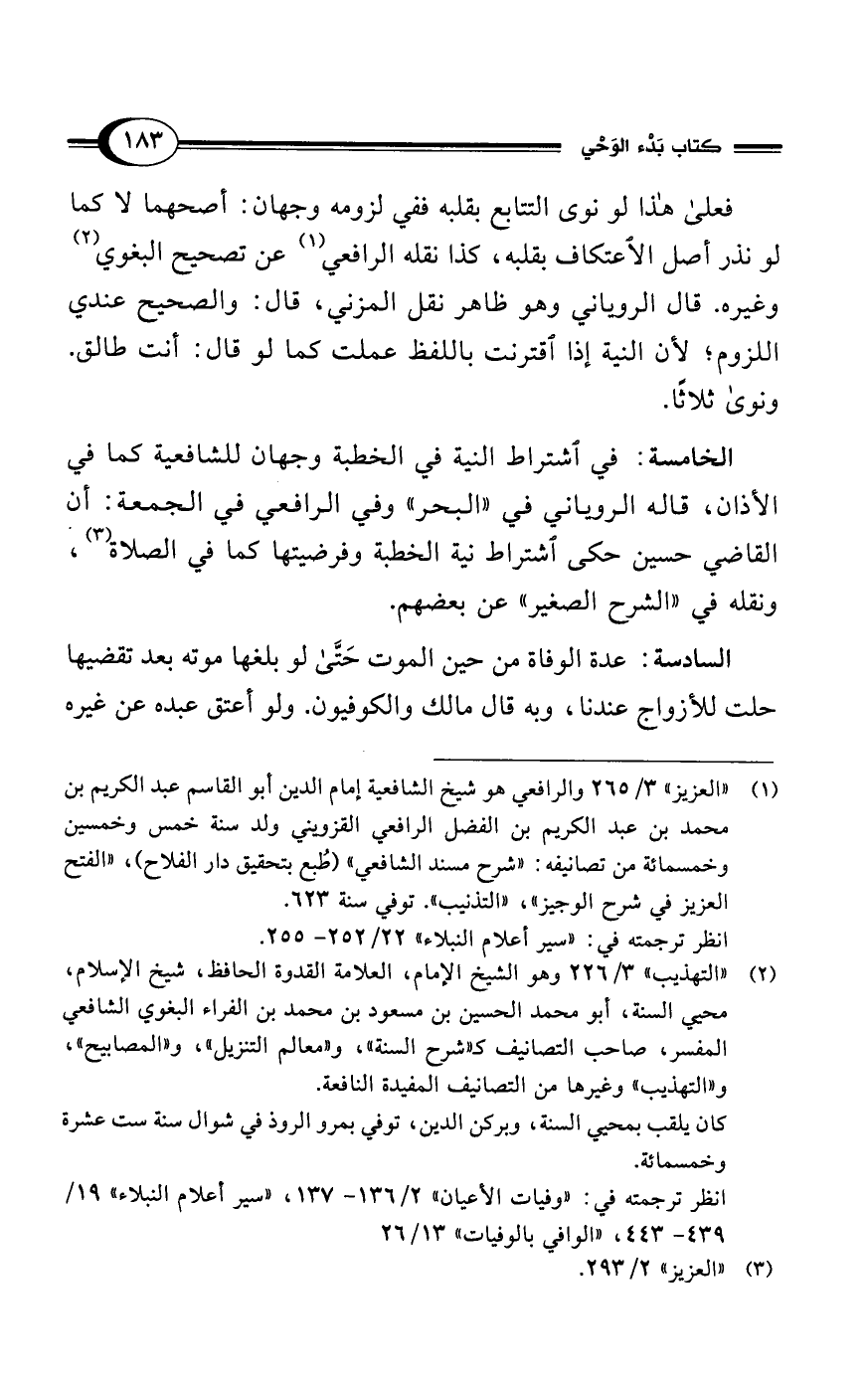 (¬1) "العزيز" 3/ 265 والرافعي هو شيخ الشافعية إمام الدين أبو القاسم عبد الكريم بن محمد بن عبد الكريم بن الفضل الرافعي القزويني ولد سنة خمس وخمسين وخمسمائة من تصانيفه: "شرح مسند الشافعي" (طُبع بتحقيق دار الفلاح)، "الفتح العزيز في شرح الوجيز"، "التذنيب". توفي سنة 623.