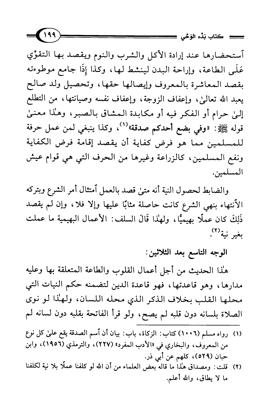 استحضارها عند إرادة الأكل والشرب والنوم ويقصد بها التقوِّي عَلَى الطاعة، وإراحة البدن لينشط لها، وكذا إِذَا جامع موطوءته بقصد المعاشرة بالمعروف وإيصالها حقها، وتحصيل ولد صالح يعبد الله تعالى، وإعفاف الزوجة، وإعفاف نفسه وصيانتها، من التطلع إلى حرام أو الفكر فيه أو مكابدة المشاق بالصبر، وهذا معنى قوله - صلى الله عليه وسلم -: "وفي بضع أحدكم صدقة" (¬1)، وكذا ينبغي لمن عمل حرفة للمسلمين مما هو فرض كفاية أن يقصد إقامة فرض الكفاية ونفع المسلمين، كالزراعة وغيرها من الحرف التي هي قوام عيش المسلمين.