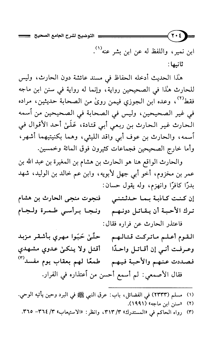 هذا الحديث أدخله الحفاظ في مسند عائشة دون الحارث، وليس للحارث هذا في الصحيحين رواية، وإنما له رواية في سنن ابن ماجه فقط (¬2)، وعده ابن الجوزي فيمن روى من الصحابة حديثين، مراده في غير الصحيحين، وليس في الصحابة في الصحيحين من اسمه الحارث غير الحارث بن ربعي أبي قتادة، على أحد الأقوال في اسمه، والحارث بن عوف أبي واقد الليثي، وهما بكنيتيهما أشهر، وأما خارج الصحيحين فجماعات كثيرون فوق المائة وخمسين.