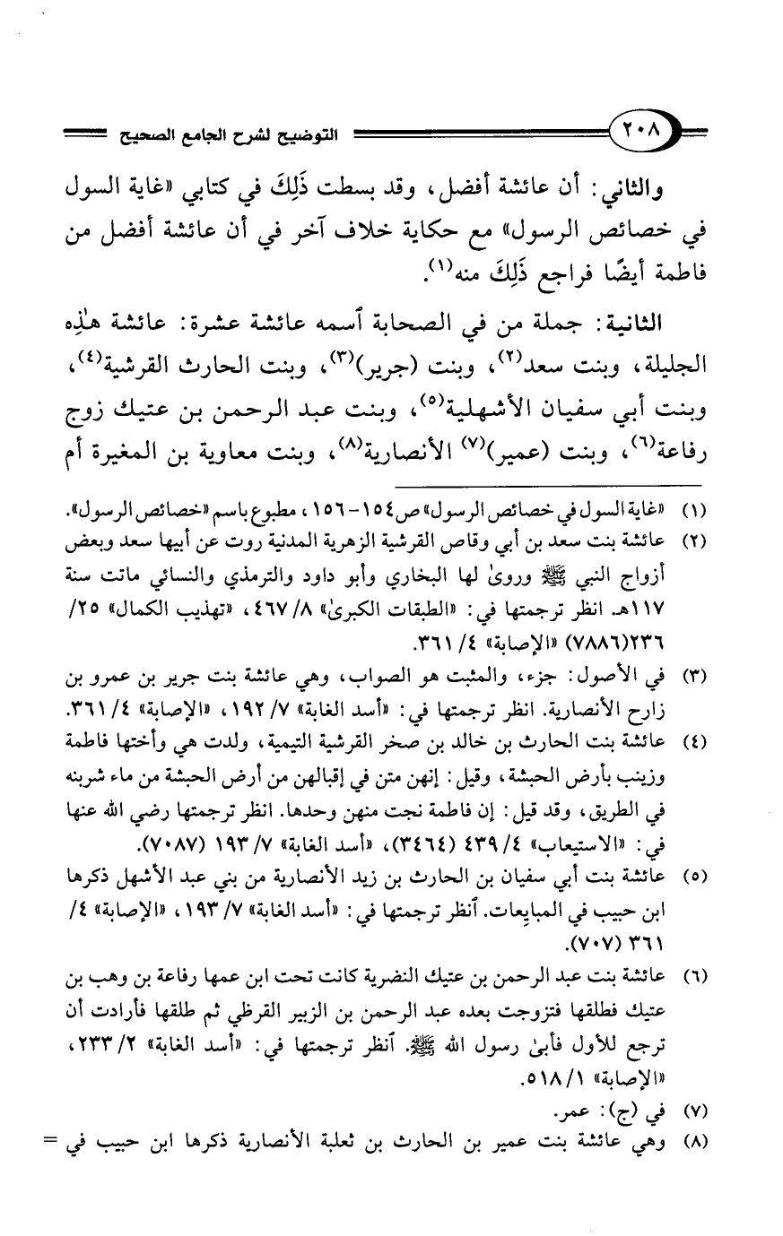 (¬6) عائشة بنت عبد الرحمن بن عتيك النضرية كانت تحت ابن عمها رفاعة بن وهب بن عتيك فطلقها فتزوجت بعده عبد الرحمن بن الزبير القرظي ثم طلقها فأرادت أن ترجع للأول فأبى رسول الله - صلى الله عليه وسلم -. انظر ترجمتها في: "أسد الغابة" 2/ 233، "الإصابة" 1/ 518.