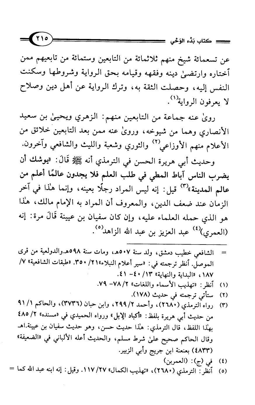 وحديث أبي هريرة الحسن في الترمذي أنه - صلى الله عليه وسلم - قَالَ: "يوشك أن يضرب الناس آباط المطي في طلب العلم فلا يجدون عالمًا أعلم من عالم المدينة" (¬3) قيل: إنه ليس المراد رجلًا بعينه، وإنما هذا في آخر الزمان عند ضعف الدين، والمعروف أن المراد به الإمام مالك، هذا هو الذي حمله العلماء عليه، وإن كان سفيان بن عيينة قَالَ مرة: إنه (العمري) (¬4) عبد العزيز بن عبد الله الزاهد (¬5).