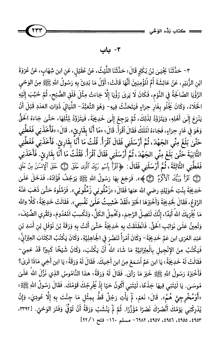 3 - حَدَّثَنَا يَحْيَى بْنُ بُكَيْرٍ قَالَ حَدَّثَنَا اللَّيْثُ، عَنْ عُقَيْلٍ، عَنِ ابْنِ شِهَابٍ، عَنْ عُرْوَةَ بْنِ الزُّبَيْرِ، عَنْ عَائِشَةَ أُمِّ الْمُؤْمِنِينَ أَنَّهَا قَالَتْ: أَوَّلُ مَا بُدِئَ بِهِ رَسُولُ اللهِ - صلى الله عليه وسلم - مِنَ الْوَحْىِ الرُّؤْيَا الصَّالِحَةُ فِى النَّوْمِ، فَكَانَ لاَ يَرَى رُؤْيَا إِلاَّ جَاءَتْ مِثْلَ فَلَقِ الصُّبْحِ، ثُمَّ حُبِّبَ إِلَيْهِ الْخَلاَءُ، وَكَانَ يَخْلُو بِغَارِ حِرَاءٍ فَيَتَحَنَّثُ فِيهِ -وَهُوَ التَّعَبُّدُ- اللَّيَالِىَ ذَوَاتِ الْعَدَدِ قَبْلَ أَنْ يَنْزِعَ إِلَى أَهْلِهِ، وَيَتَزَوَّدُ لِذَلِكَ، ثُمَّ يَرْجِعُ إِلَى خَدِيجَةَ، فَيَتَزَوَّدُ لِمِثْلِهَا، حَتَّى جَاءَهُ الْحَقُّ وَهُوَ فِى غَارِ حِرَاءٍ، فَجَاءَهُ الْمَلَكُ فَقَالَ اقْرَأْ. قَالَ "مَا أَنَا بِقَارِئٍ". قَالَ "فَأَخَذَنِى فَغَطَّنِى حَتَّى بَلَغَ مِنِّى الْجَهْدَ، ثُمَّ أَرْسَلَنِى فَقَالَ اقْرَأْ. قُلْتُ مَا أَنَا بِقَارِئٍ. فَأَخَذَنِى فَغَطَّنِى الثَّانِيَةَ حَتَّى بَلَغَ مِنِّى الْجَهْدَ، ثُمَّ أَرْسَلَنِى فَقَالَ اقْرَأْ. فَقُلْتُ مَا أَنَا بِقَارِئٍ. فَأَخَذَنِى فَغَطَّنِى الثَّالِثَةَ، ثُمَّ أَرْسَلَنِى فَقَالَ: {اقْرَأْ بِاسْمِ رَبِّكَ الَّذِي خَلَقَ (1) خَلَقَ الْإِنْسَانَ مِنْ عَلَقٍ (2) اقْرَأْ وَرَبُّكَ الْأَكْرَمُ (3)}. فَرَجَعَ بِهَا رَسُولُ اللهِ - صلى الله عليه وسلم - يَرْجُفُ فُؤَادُهُ، فَدَخَلَ عَلَى خَدِيجَةَ بِنْتِ خُوَيْلِدٍ رضى الله عنها فَقَالَ: "زَمِّلُونِى زَمِّلُونِى". فَزَمَّلُوهُ حَتَّى ذَهَبَ عَنْهُ الرَّوْعُ، فَقَالَ لِخَدِيجَةَ وَأَخْبَرَهَا الْخَبَرَ "لَقَدْ خَشِيتُ عَلَى نَفْسِى". فَقَالَتْ خَدِيجَةُ: كَلاَّ وَاللهِ مَا يُخْزِيكَ اللهُ أَبَدًا، إِنَّكَ لَتَصِلُ الرَّحِمَ، وَتَحْمِلُ الْكَلَّ، وَتَكْسِبُ الْمَعْدُومَ، وَتَقْرِى الضَّيْفَ، وَتُعِينُ عَلَى نَوَائِبِ الْحَقِّ. فَانْطَلَقَتْ بِهِ خَدِيجَةُ حَتَّى أَتَتْ بِهِ وَرَقَةَ بْنَ نَوْفَلِ بْنِ أَسَدِ بْنِ عَبْدِ الْعُزَّى ابْنَ عَمِّ خَدِيجَةَ -وَكَانَ امْرَأً تَنَصَّرَ فِى الْجَاهِلِيَّةِ، وَكَانَ يَكْتُبُ الْكِتَابَ الْعِبْرَانِىَّ، فَيَكْتُبُ مِنَ الإِنْجِيلِ بِالْعِبْرَانِيَّةِ مَا شَاءَ اللهُ أَنْ يَكْتُبَ، وَكَانَ شَيْخًا كَبِيرًا قَدْ عَمِىَ- فَقَالَتْ لَهُ خَدِيجَةُ: يَا ابْنَ عَمِّ اسْمَعْ مِنَ ابْنِ أَخِيكَ. فَقَالَ لَهُ وَرَقَةُ: يَا ابْنَ أَخِى مَاذَا تَرَى؟ فَأَخْبَرَهُ رَسُولُ اللهِ - صلى الله عليه وسلم - خَبَرَ مَا رَأَى. فَقَالَ لَهُ وَرَقَةُ: هَذَا النَّامُوسُ الَّذِى نَزَّلَ اللهُ عَلَى مُوسَى. يَا لَيْتَنِى فِيهَا جَذَعًا، لَيْتَنِى أَكُونُ حَيًّا إِذْ يُخْرِجُكَ قَوْمُكَ. فَقَالَ رَسُولُ اللهِ - صلى الله عليه وسلم - "أَوَمُخْرِجِىَّ هُمْ". قَالَ نَعَمْ، لَمْ يَأْتِ رَجُلٌ قَطُّ بِمِثْلِ مَا جِئْتَ بِهِ إِلاَّ عُودِىَ، وَإِنْ يُدْرِكْنِى يَوْمُكَ أَنْصُرْكَ نَصْرًا مُؤَزَّرًا. ثُمَّ لَمْ يَنْشَبْ وَرَقَةُ أَنْ تُوُفِّىَ وَفَتَرَ الْوَحْىُ. [3392، 4953، 4955، 4956، 4957، 6982 - مسلم 160 - فتح 22/ 1]