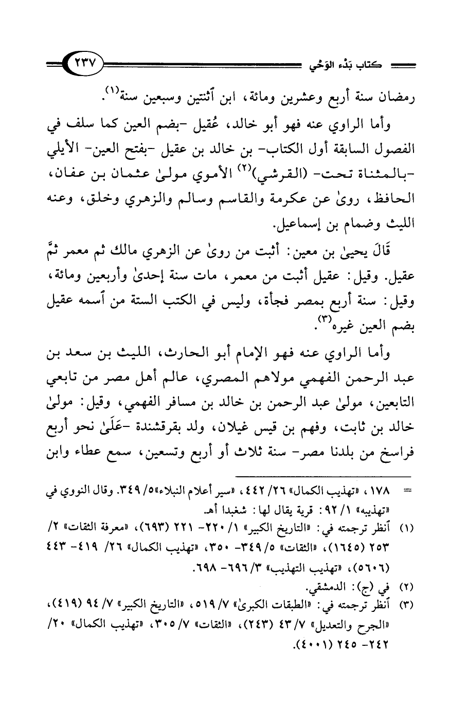 وأما الراوي عنه فهو أبو خالد، عُقيل -بضم العين كما سلف في الفصول السابقة أول الكتاب- بن خالد بن عقيل -بفتح العين- الأيلي -بالمثناة تحت- (القرشي) (¬2) الأموي مولى عثمان بن عفان، الحافظ، روى عن عكرمة والقاسم وسالم والزهري وخلق، وعنه الليث وضمام بن إسماعيل.