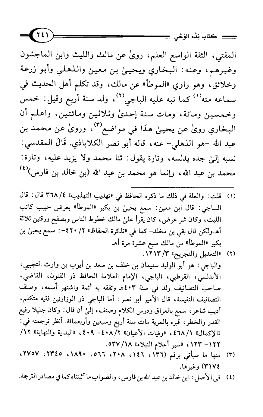 (¬1) قلت: والعلة في ذلك ما ذكره الحافظ في "تهذيب التهذيب" 4/ 368 قال: قال الساجي: قال ابن معين: سمع يحيى بن بكير "الموطأ" بعرض حبيب كاتب الليث، وكان شر عرض، كان يقرأ على مالك خطوط الناس ويصفح ورقتين ثلاثة أهـ. ولكن قال بقي بن مخلد -كما في "تذكرة الحفاظ" 2/ 420 - : سمع يحيى بن بكير "الموطأ" من مالك سبع عشرة مرة أهـ.