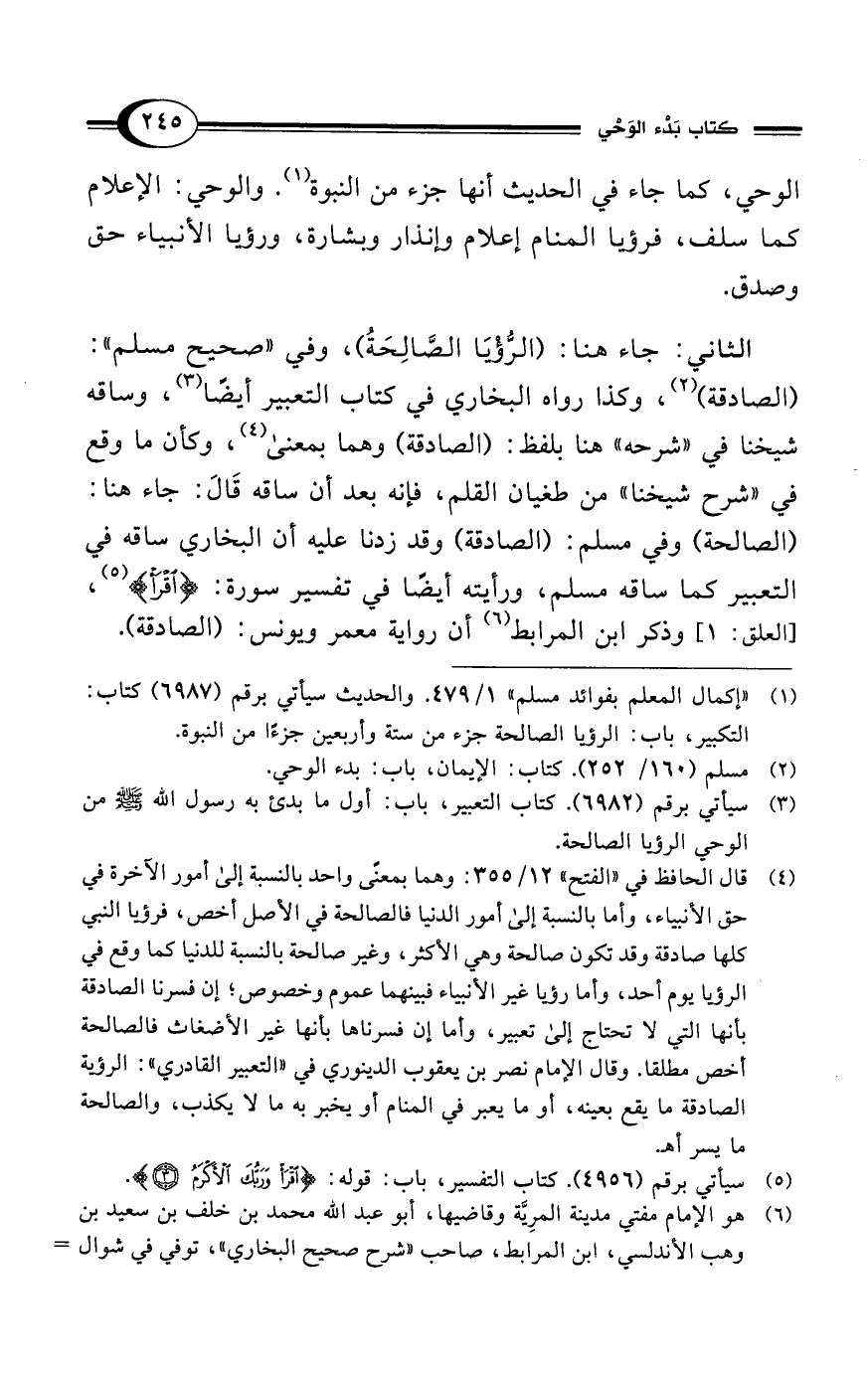 (¬1) "إكمال المعلم بفوائد مسلم" 1/ 479. والحديث سيأتي برقم (6987) كتاب: التكبير، باب: الرؤيا الصالحة جزء من ستة وأربعين جزءًا من النبوة.